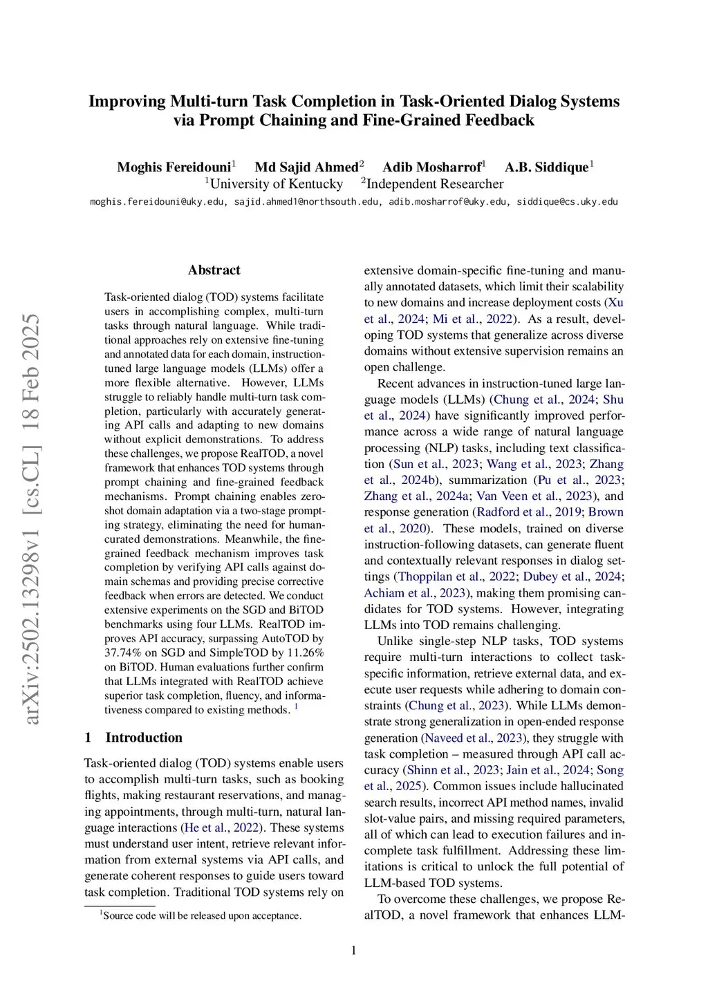 Task-oriented dialog (TOD) systems facilitate users in accomplishing complex, multi-turn tasks through natural language. While instruction-tuned large language models (LLMs) have demonstrated strong performance on a range of single-turn NLP tasks, they often struggle with reliable multi-turn task completion in TOD settings, particularly when generating API calls required to interact with external systems. To address this, we introduce RealTOD, a novel framework that improves LLM-based TOD systems through (1) prompt chaining and (2) fine-grained feedback. Prompt chaining enables zero-shot generalization to new domains by automatically synthesizing a schema-aligned in-context example for the target task. Fine-grained feedback verifies each generated API call against the domain schema, identifies specific errors, and provides targeted correction prompts. To evaluate task completion reliability, we introduce full API Call Accuracy as a robust metric, along with detailed sub-metrics to capture common failure modes. We conduct extensive experiments on the SGD and BiTOD benchmarks using four LLMs. RealTOD improves Full API accuracy, surpassing state-of-the-art AutoTOD by 37.10% on SGD and supervised learning-based baseline SimpleTOD by 10.32% on BiTOD. Human evaluations further confirm that LLMs integrated with RealTOD achieve superior task completion, fluency, and informativeness compared to existing methods.