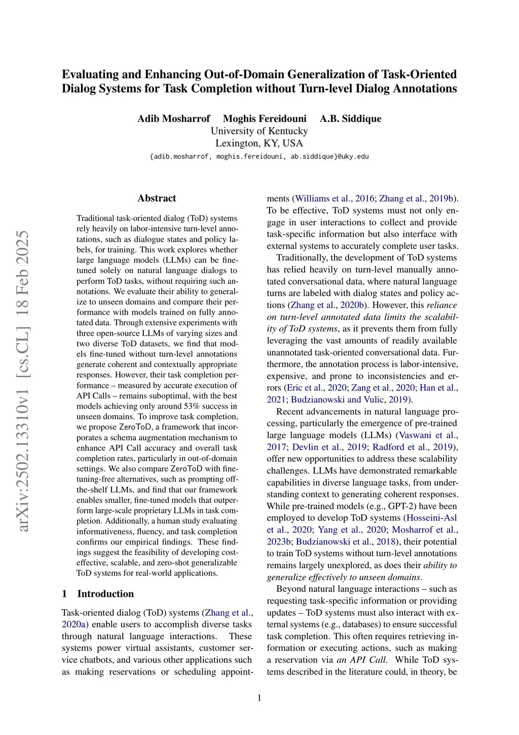 Traditional task-oriented dialog (ToD) systems rely heavily on labor-intensive turn-level annotations, such as dialogue states and policy labels, for training. This work explores whether large language models (LLMs) can be fine-tuned solely on natural language dialogs to perform ToD tasks, without requiring such annotations. We evaluate their ability to generalize to unseen domains and compare their performance with models trained on fully annotated data. Through extensive experiments with three open-source LLMs of varying sizes and two diverse ToD datasets, we find that models fine-tuned without turn-level annotations generate coherent and contextually appropriate responses. However, their task completion performance - measured by accurate execution of API calls - remains suboptimal, with the best models achieving only around 53% success in unseen domains. To improve task completion, we propose ZeroToD, a framework that incorporates a schema augmentation mechanism to enhance API call accuracy and overall task completion rates, particularly in out-of-domain settings. We also compare ZeroToD with fine-tuning-free alternatives, such as prompting off-the-shelf LLMs, and find that our framework enables smaller, fine-tuned models that outperform large-scale proprietary LLMs in task completion. Additionally, a human study evaluating informativeness, fluency, and task completion confirms our empirical findings. These findings suggest the feasibility of developing cost-effective, scalable, and zero-shot generalizable ToD systems for real-world applications.