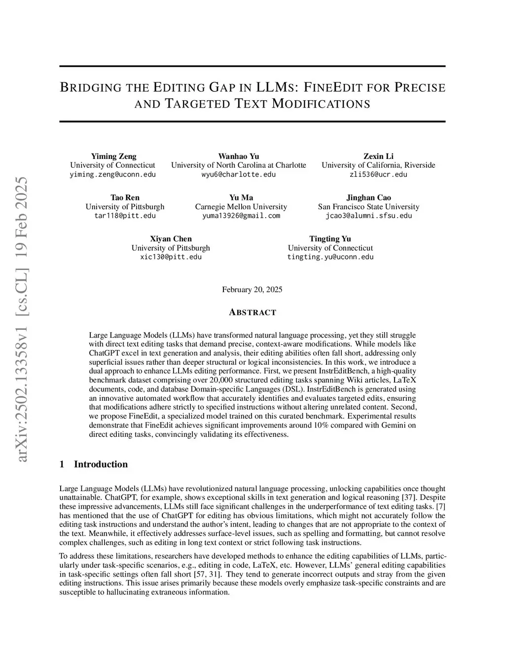 Large Language Models (LLMs) have significantly advanced natural language processing, demonstrating strong capabilities in tasks such as text generation, summarization, and reasoning. Recently, their potential for automating precise text editing tasks across specialized domains, such as programming code, LaTeX, and structured database languages, has gained attention. However, current state-of-the-art LLMs still struggle with executing precise, instruction-driven edits, particularly when structural accuracy and strict adherence to domain conventions are required. To address these challenges, we introduce InstrEditBench, an automated benchmark dataset comprising over 30,000 structured editing tasks spanning diverse domains, including Wikipedia articles, LaTeX documents, source code, and database languages. Using this benchmark, we develop FineEdit, a specialized editing model explicitly trained for accurate, context-aware text modifications. Experimental evaluations demonstrate that FineEdit outperforms state-of-the-art models, achieving improvements of approximately 10\% over Gemini models on single-turn edits, up to 30\% over Llama-3.2-3B, and exceeding Mistral-7B-OpenOrca performance by over 40\% on direct editing tasks. FineEdit also effectively generalizes to realistic multi-turn editing scenarios, highlighting its practical applicability. To facilitate further research and reproducibility, we release FineEdit atthis https URL} andthis https URL.