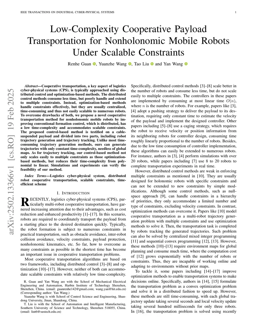 Cooperative transportation, a key aspect of logisticscyber-physical systems (CPS), is typically approached using dis tributed control and optimization-based methods. The distributedcontrol methods consume less time, but poorly handle and extendto multiple constraints. Instead, optimization-based methodshandle constraints effectively, but they are usually centralized,time-consuming and thus not easily scalable to numerous robots.To overcome drawbacks of both, we propose a novel cooperativetransportation method for nonholonomic mobile robots by im proving conventional formation control, which is distributed, hasa low time-complexity and accommodates scalable constraints.The proposed control-based method is testified on a cable suspended payload and divided into two parts, including robottrajectory generation and trajectory tracking. Unlike most time consuming trajectory generation methods, ours can generatetrajectories with only constant time-complexity, needless of globalmaps. As for trajectory tracking, our control-based method notonly scales easily to multiple constraints as those optimization based methods, but reduces their time-complexity from poly nomial to linear. Simulations and experiments can verify thefeasibility of our method.