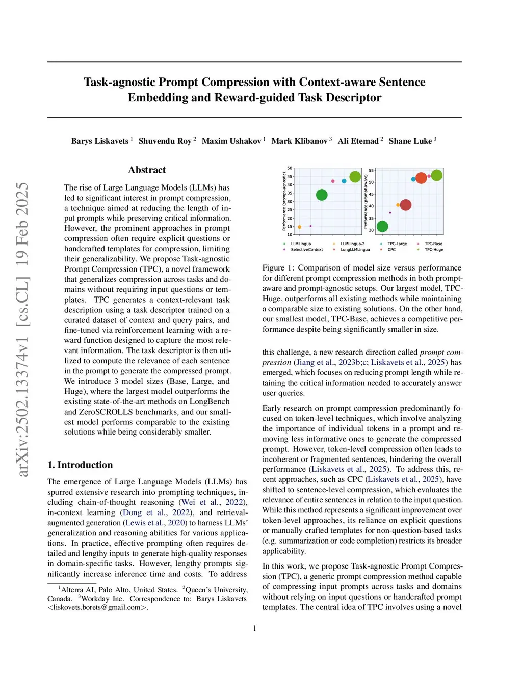 Task-agnostic Prompt Compression with Context-aware Sentence Embedding and Reward-guided Task Descriptor