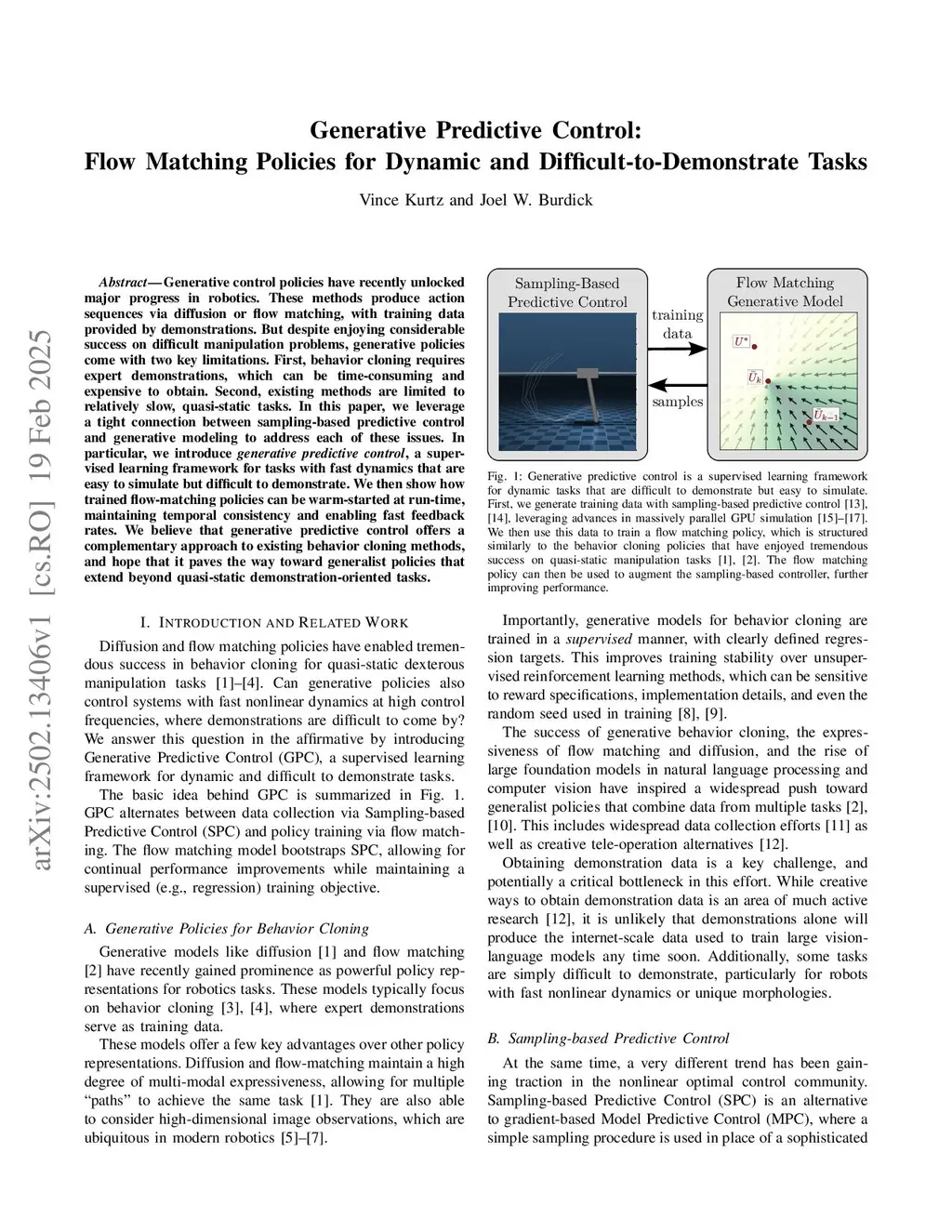 Generative control policies have recently unlocked major progress in robotics. These methods produce action sequences via diffusion or flow matching, with training data provided by demonstrations. But existing methods come with two key limitations: they require expert demonstrations, which can be difficult to obtain, and they are limited to relatively slow, quasi-static tasks. In this paper, we leverage a tight connection between sampling-based predictive control and generative modeling to address each of these issues. In particular, we introduce generative predictive control, a supervised learning framework for tasks with fast dynamics that are easy to simulate but difficult to demonstrate. We then show how trained flow-matching policies can be warm-started at inference time, maintaining temporal consistency and enabling high-frequency feedback. We believe that generative predictive control offers a complementary approach to existing behavior cloning methods, and hope that it paves the way toward generalist policies that extend beyond quasi-static demonstration-oriented tasks.