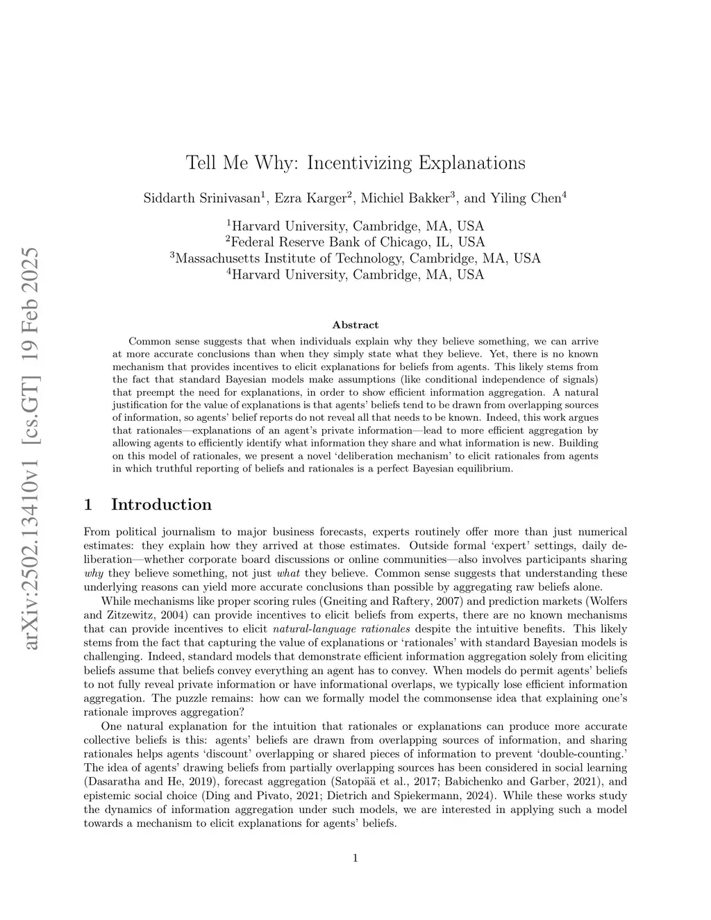 Common sense suggests that when individuals explain why they believe something, we can arrive at more accurate conclusions than when they simply state what they believe. Yet, there is no known mechanism that provides incentives to elicit explanations for beliefs from agents. This likely stems from the fact that standard Bayesian models make assumptions (like conditional independence of signals) that preempt the need for explanations, in order to show efficient information aggregation. A natural justification for the value of explanations is that agents' beliefs tend to be drawn from overlapping sources of information, so agents' belief reports do not reveal all that needs to be known. Indeed, this work argues that rationales-explanations of an agent's private information-lead to more efficient aggregation by allowing agents to efficiently identify what information they share and what information is new. Building on this model of rationales, we present a novel 'deliberation mechanism' to elicit rationales from agents in which truthful reporting of beliefs and rationales is a perfect Bayesian equilibrium.