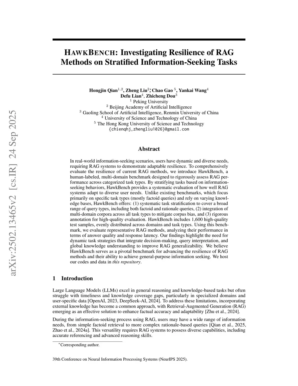 In real-world information-seeking scenarios, users have dynamic and diverse needs, requiring RAG systems to demonstrate adaptable resilience. To comprehensively evaluate the resilience of current RAG methods, we introduce HawkBench, a human-labeled, multi-domain benchmark designed to rigorously assess RAG performance across categorized task types. By stratifying tasks based on information-seeking behaviors, HawkBench provides a systematic evaluation of how well RAG systems adapt to diverse user needs.Unlike existing benchmarks, which focus primarily on specific task types (mostly factoid queries) and rely on varying knowledge bases, HawkBench offers: (1) systematic task stratification to cover a broad range of query types, including both factoid and rationale queries, (2) integration of multi-domain corpora across all task types to mitigate corpus bias, and (3) rigorous annotation for high-quality evaluation.HawkBench includes 1,600 high-quality test samples, evenly distributed across domains and task types. Using this benchmark, we evaluate representative RAG methods, analyzing their performance in terms of answer quality and response latency. Our findings highlight the need for dynamic task strategies that integrate decision-making, query interpretation, and global knowledge understanding to improve RAG generalizability. We believe HawkBench serves as a pivotal benchmark for advancing the resilience of RAG methods and their ability to achieve general-purpose information seeking.