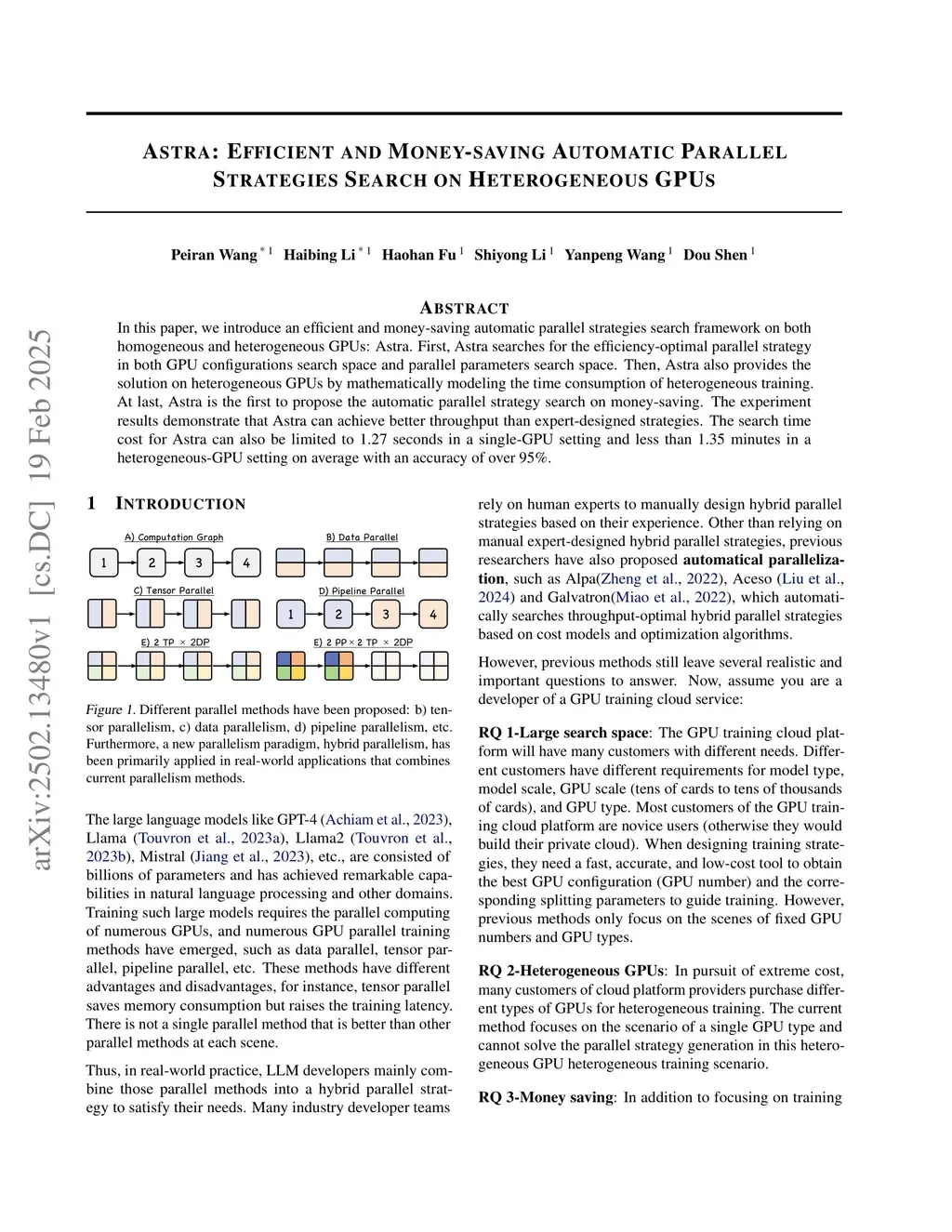 In this paper, we introduce an efficient and money-saving automatic parallel strategies search framework on heterogeneous GPUs: Astra. First, Astra searches for the efficiency-optimal parallel strategy in both GPU configurations search space (GPU types and GPU numbers) and parallel parameters search space. Then, Astra also provides the solution on heterogeneous GPUs by mathematically modeling the time consumption of heterogeneous training. At last, Astra is the first to propose the automatic parallel strategy search on money-saving. The experiment results demonstrate that Astra can achieve better throughput than expert-designed strategies. The search time cost for Astra can also be limited to 1.27 seconds in a single-GPU setting and less than 1.35 minutes in a heterogeneous-GPU setting on average with an accuracy of over 95%.