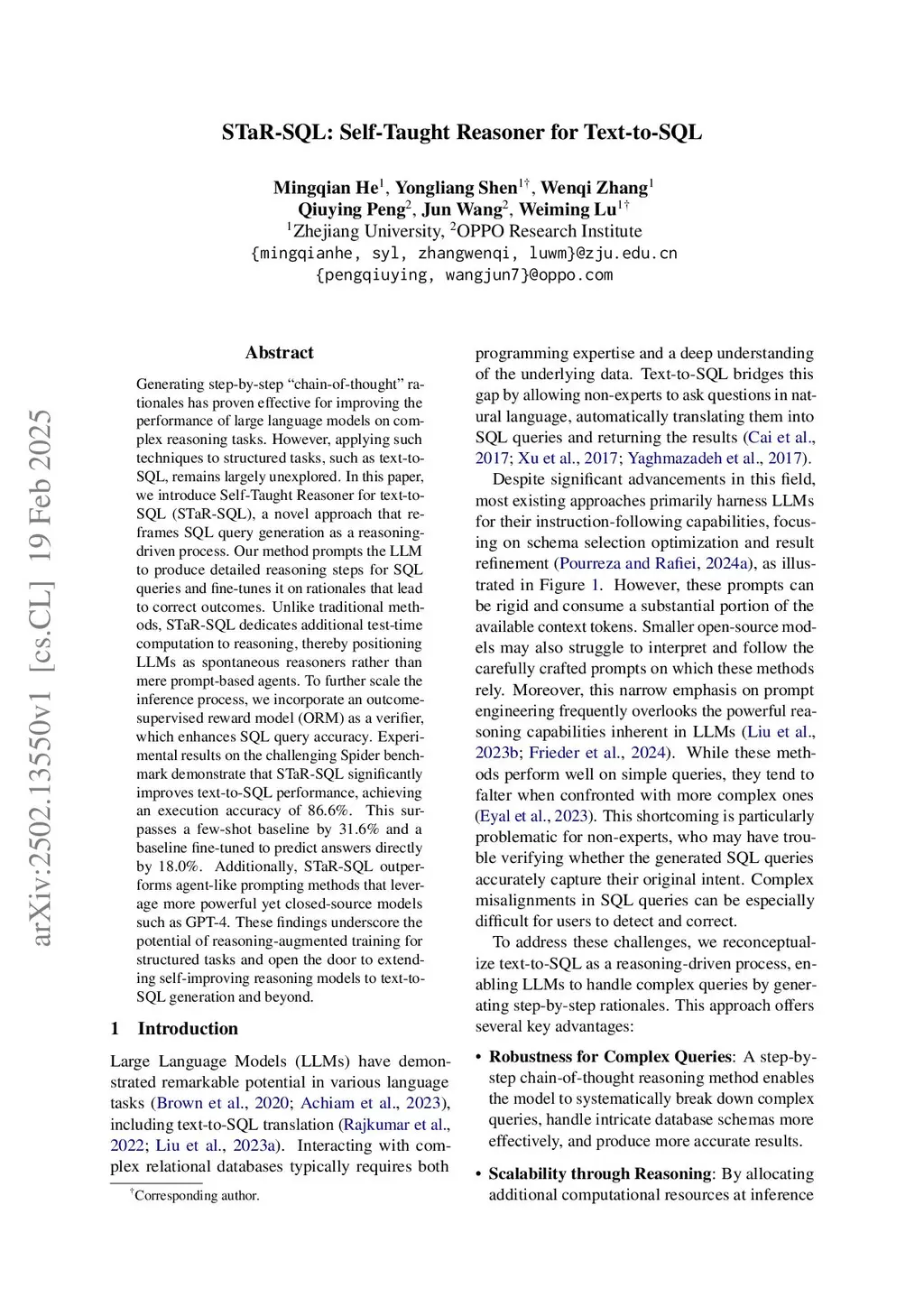 Generating step-by-step "chain-of-thought" rationales has proven effective for improving the performance of large language models on complex reasoning tasks. However, applying such techniques to structured tasks, such as text-to-SQL, remains largely unexplored. In this paper, we introduce Self-Taught Reasoner for text-to-SQL (STaR-SQL), a novel approach that reframes SQL query generation as a reasoning-driven process. Our method prompts the LLM to produce detailed reasoning steps for SQL queries and fine-tunes it on rationales that lead to correct outcomes. Unlike traditional methods, STaR-SQL dedicates additional test-time computation to reasoning, thereby positioning LLMs as spontaneous reasoners rather than mere prompt-based agents. To further scale the inference process, we incorporate an outcome-supervised reward model (ORM) as a verifier, which enhances SQL query accuracy. Experimental results on the challenging Spider benchmark demonstrate that STaR-SQL significantly improves text-to-SQL performance, achieving an execution accuracy of 86.6%. This surpasses a few-shot baseline by 31.6% and a baseline fine-tuned to predict answers directly by 18.0%. Additionally, STaR-SQL outperforms agent-like prompting methods that leverage more powerful yet closed-source models such as GPT-4. These findings underscore the potential of reasoning-augmented training for structured tasks and open the door to extending self-improving reasoning models to text-to-SQL generation and beyond.