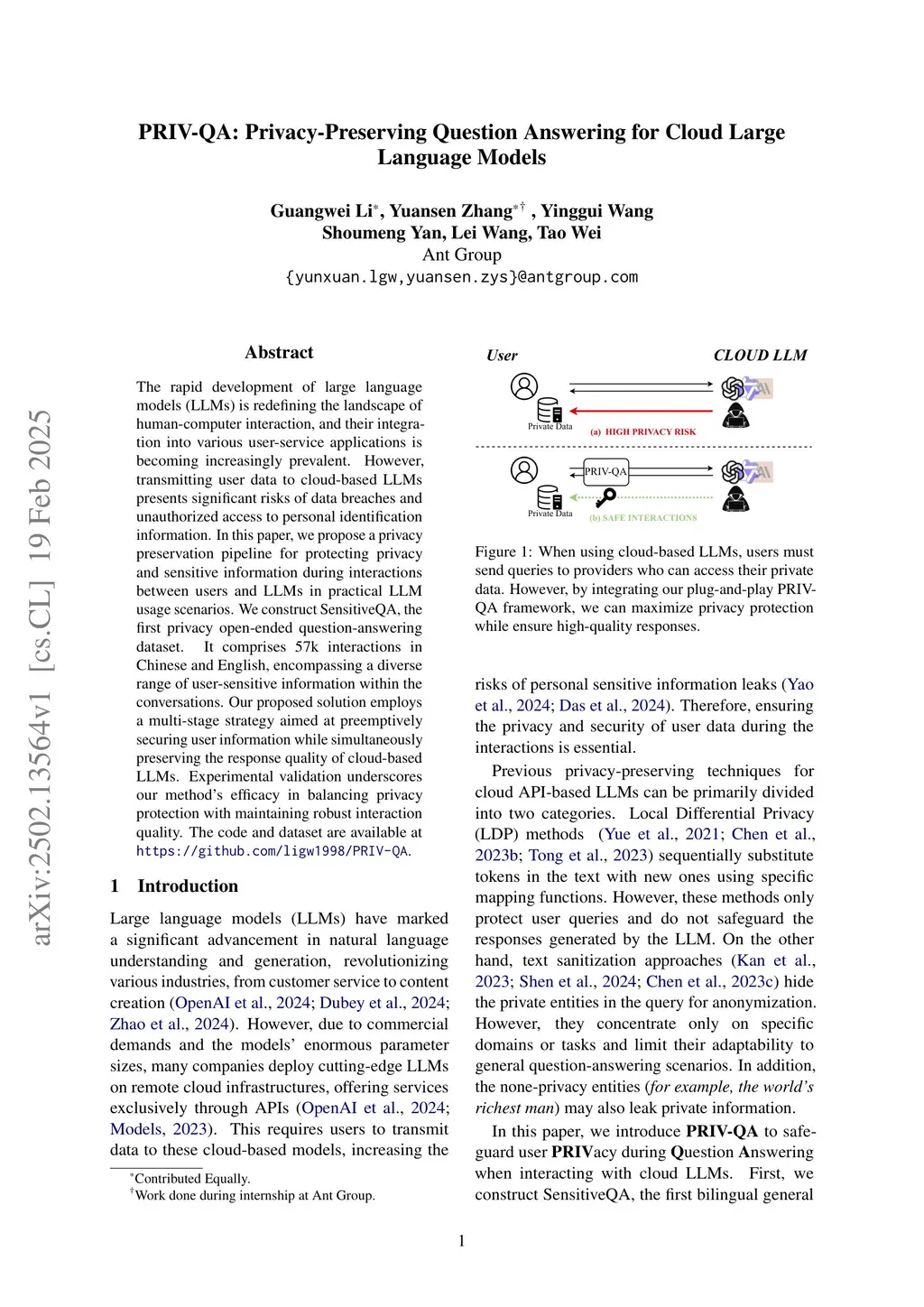 PRIV-QA: Privacy-Preserving Question Answering for Cloud Large Language Models