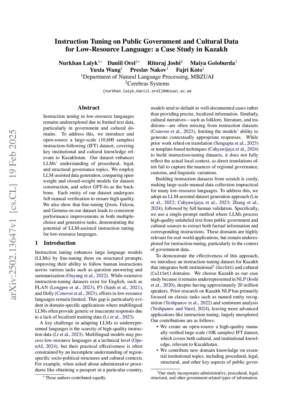 Instruction tuning in low-resource languages remains underexplored due to limited text data, particularly in government and cultural domains. To address this, we introduce and open-source a large-scale (10,600 samples) instruction-following (IFT) dataset, covering key institutional and cultural knowledge relevant to Kazakhstan. Our dataset enhances LLMs' understanding of procedural, legal, and structural governance topics. We employ LLM-assisted data generation, comparing open-weight and closed-weight models for dataset construction, and select GPT-4o as the backbone. Each entity of our dataset undergoes full manual verification to ensure high quality. We also show that fine-tuning Qwen, Falcon, and Gemma on our dataset leads to consistent performance improvements in both multiple-choice and generative tasks, demonstrating the potential of LLM-assisted instruction tuning for low-resource languages.