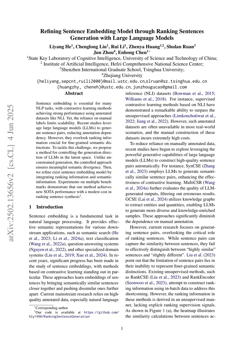 Sentence embedding is essential for many NLP tasks, with contrastive learning methods achieving strong performance using annotated datasets like NLI. Yet, the reliance on manual labels limits scalability. Recent studies leverage large language models (LLMs) to generate sentence pairs, reducing annotation dependency. However, they overlook ranking information crucial for fine-grained semantic distinctions. To tackle this challenge, we propose a method for controlling the generation direction of LLMs in the latent space. Unlike unconstrained generation, the controlled approach ensures meaningful semantic divergence. Then, we refine exist sentence embedding model by integrating ranking information and semantic information. Experiments on multiple benchmarks demonstrate that our method achieves new SOTA performance with a modest cost in ranking sentence synthesis.