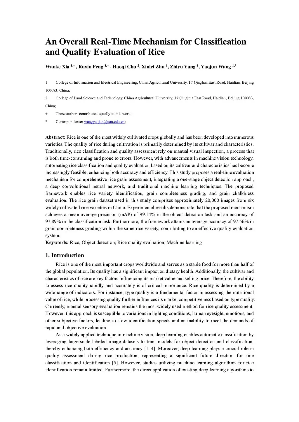 Rice is one of the most widely cultivated crops globally and has been developed into numerous varieties. The quality of rice during cultivation is primarily determined by its cultivar and characteristics. Traditionally, rice classification and quality assessment rely on manual visual inspection, a process that is both time-consuming and prone to errors. However, with advancements in machine vision technology, automating rice classification and quality evaluation based on its cultivar and characteristics has become increasingly feasible, enhancing both accuracy and efficiency. This study proposes a real-time evaluation mechanism for comprehensive rice grain assessment, integrating a one-stage object detection approach, a deep convolutional neural network, and traditional machine learning techniques. The proposed framework enables rice variety identification, grain completeness grading, and grain chalkiness evaluation. The rice grain dataset used in this study comprises approximately 20,000 images from six widely cultivated rice varieties in China. Experimental results demonstrate that the proposed mechanism achieves a mean average precision (mAP) of 99.14% in the object detection task and an accuracy of 97.89% in the classification task. Furthermore, the framework attains an average accuracy of 97.56% in grain completeness grading within the same rice variety, contributing to an effective quality evaluation system.