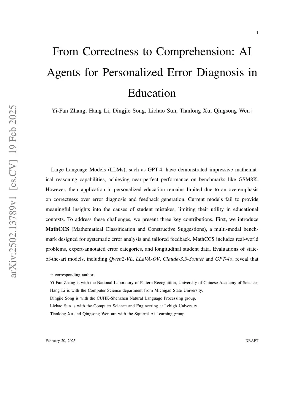 Large Language Models (LLMs), such as GPT-4, have demonstrated impressive mathematical reasoning capabilities, achieving near-perfect performance on benchmarks like GSM8K. However, their application in personalized education remains limited due to an overemphasis on correctness over error diagnosis and feedback generation. Current models fail to provide meaningful insights into the causes of student mistakes, limiting their utility in educational contexts. To address these challenges, we present three key contributions. First, we introduce \textbf{MathCCS} (Mathematical Classification and Constructive Suggestions), a multi-modal benchmark designed for systematic error analysis and tailored feedback. MathCCS includes real-world problems, expert-annotated error categories, and longitudinal student data. Evaluations of state-of-the-art models, including \textit{Qwen2-VL}, \textit{LLaVA-OV}, \textit{Claude-3.5-Sonnet} and \textit{GPT-4o}, reveal that none achieved classification accuracy above 30\% or generated high-quality suggestions (average scores below 4/10), highlighting a significant gap from human-level performance. Second, we develop a sequential error analysis framework that leverages historical data to track trends and improve diagnostic precision. Finally, we propose a multi-agent collaborative framework that combines a Time Series Agent for historical analysis and an MLLM Agent for real-time refinement, enhancing error classification and feedback generation. Together, these contributions provide a robust platform for advancing personalized education, bridging the gap between current AI capabilities and the demands of real-world teaching.