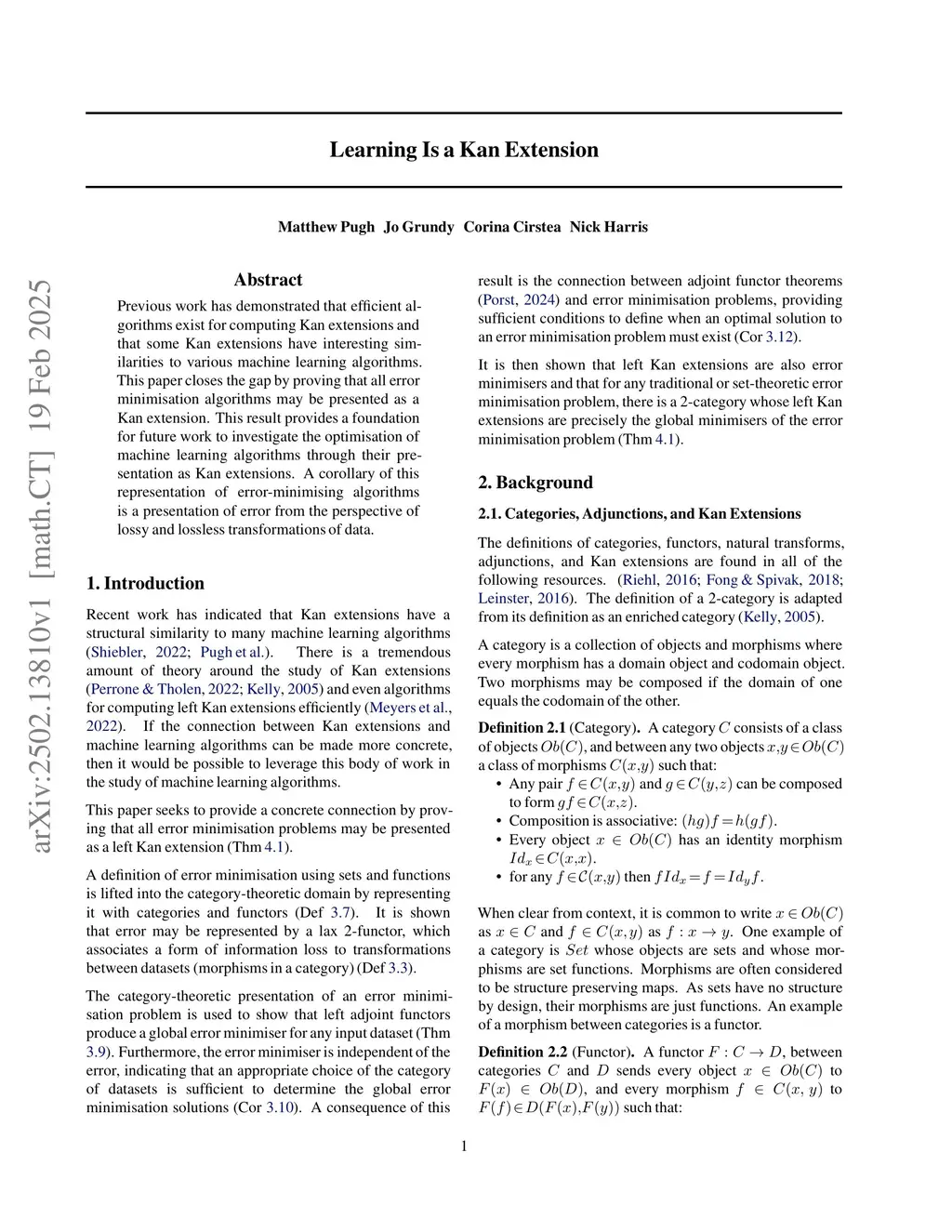 Previous work has demonstrated that efficient algorithms exist for computing Kan extensions and that some Kan extensions have interesting similarities to various machine learning algorithms. This paper closes the gap by proving that all error minimisation algorithms may be presented as a Kan extension. This result provides a foundation for future work to investigate the optimisation of machine learning algorithms through their presentation as Kan extensions. A corollary of this representation of error-minimising algorithms is a presentation of error from the perspective of lossy and lossless transformations of data.