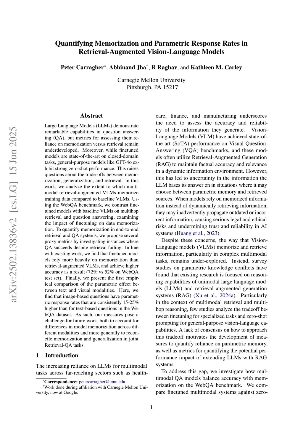 Large Language Models (LLMs) demonstrate remarkable capabilities in question answering (QA), but metrics for assessing their reliance on memorization versus retrieval remain underdeveloped. Moreover, while finetuned models are state-of-the-art on closed-domain tasks, general-purpose models like GPT-4o exhibit strong zero-shot performance. This raises questions about the trade-offs between memorization, generalization, and retrieval. In this work, we analyze the extent to which multimodal retrieval-augmented VLMs memorize training data compared to baseline VLMs. Using the WebQA benchmark, we contrast finetuned models with baseline VLMs on multihop retrieval and question answering, examining the impact of finetuning on data memorization. To quantify memorization in end-to-end retrieval and QA systems, we propose several proxy metrics by investigating instances where QA succeeds despite retrieval failing. In line with existing work, we find that finetuned models rely more heavily on memorization than retrieval-augmented VLMs, and achieve higher accuracy as a result (72% vs 52% on WebQA test set). Finally, we present the first empirical comparison of the parametric effect between text and visual modalities. Here, we find that image-based questions have parametric response rates that are consistently 15-25% higher than for text-based questions in the WebQA dataset. As such, our measures pose a challenge for future work, both to account for differences in model memorization across different modalities and more generally to reconcile memorization and generalization in joint Retrieval-QA tasks.