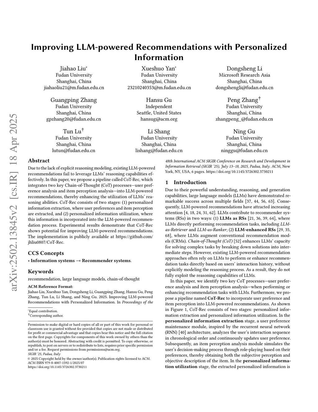 Due to the lack of explicit reasoning modeling, existing LLM-powered recommendations fail to leverage LLMs' reasoning capabilities effectively. In this paper, we propose a pipeline called CoT-Rec, which integrates two key Chain-of-Thought (CoT) processes -- user preference analysis and item perception analysis -- into LLM-powered recommendations, thereby enhancing the utilization of LLMs' reasoning abilities. CoT-Rec consists of two stages: (1) personalized information extraction, where user preferences and item perception are extracted, and (2) personalized information utilization, where this information is incorporated into the LLM-powered recommendation process. Experimental results demonstrate that CoT-Rec shows potential for improving LLM-powered recommendations. The implementation is publicly available atthis https URL.