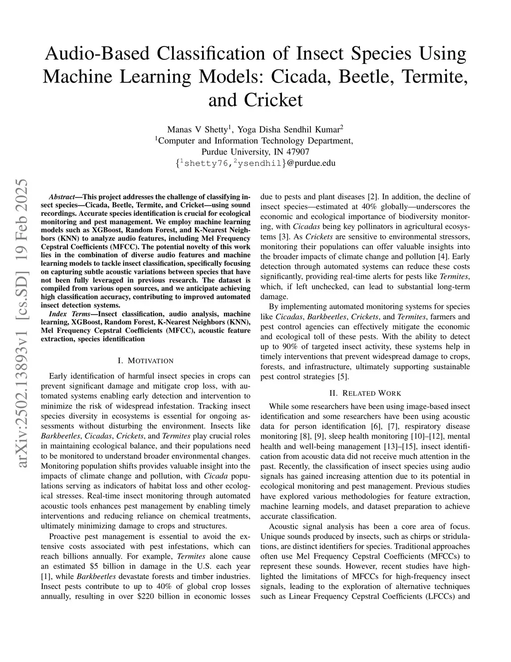 This project addresses the challenge of classifying insect species: Cicada, Beetle, Termite, and Cricket using sound recordings. Accurate species identification is crucial for ecological monitoring and pest management. We employ machine learning models such as XGBoost, Random Forest, and K Nearest Neighbors (KNN) to analyze audio features, including Mel Frequency Cepstral Coefficients (MFCC). The potential novelty of this work lies in the combination of diverse audio features and machine learning models to tackle insect classification, specifically focusing on capturing subtle acoustic variations between species that have not been fully leveraged in previous research. The dataset is compiled from various open sources, and we anticipate achieving high classification accuracy, contributing to improved automated insect detection systems.