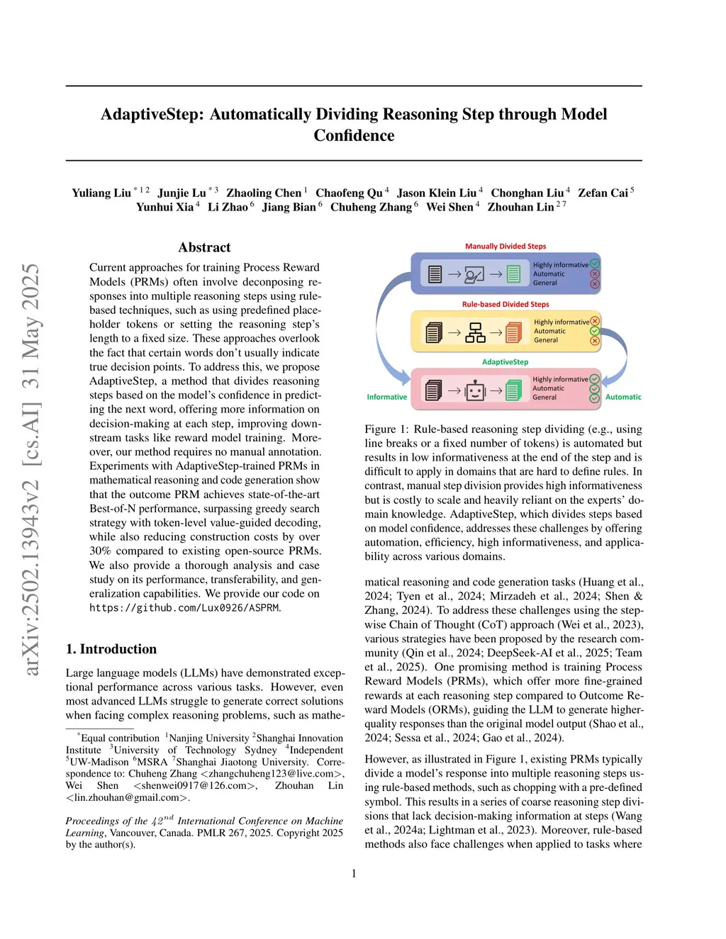 Current approaches for training Process Reward Models (PRMs) often involve breaking down responses into multiple reasoning steps using rule-based techniques, such as using predefined placeholder tokens or setting the reasoning step's length into a fixed size. These approaches overlook the fact that specific words do not typically mark true decision points in a text. To address this, we propose AdaptiveStep, a method that divides reasoning steps based on the model's confidence in predicting the next word. This division method provides more decision-making information at each step, enhancing downstream tasks, such as reward model learning. Moreover, our method does not require manual annotation. We demonstrate its effectiveness through experiments with AdaptiveStep-trained PRMs in mathematical reasoning and code generation tasks. Experimental results indicate that the outcome PRM achieves state-of-the-art Best-of-N performance, surpassing greedy search strategy with token-level value-guided decoding, while also reducing construction costs by over 30% compared to existing open-source PRMs. In addition, we provide a thorough analysis and case study on the PRM's performance, transferability, and generalization capabilities.