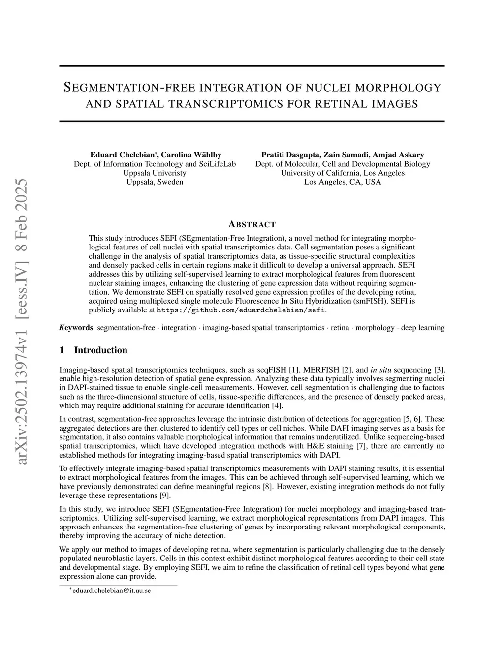 This study introduces SEFI (SEgmentation-Free Integration), a novel method for integrating morphological features of cell nuclei with spatial transcriptomics data. Cell segmentation poses a significant challenge in the analysis of spatial transcriptomics data, as tissue-specific structural complexities and densely packed cells in certain regions make it difficult to develop a universal approach. SEFI addresses this by utilizing self-supervised learning to extract morphological features from fluorescent nuclear staining images, enhancing the clustering of gene expression data without requiring segmentation. We demonstrate SEFI on spatially resolved gene expression profiles of the developing retina, acquired using multiplexed single molecule Fluorescence In Situ Hybridization (smFISH). SEFI is publicly available atthis https URL.