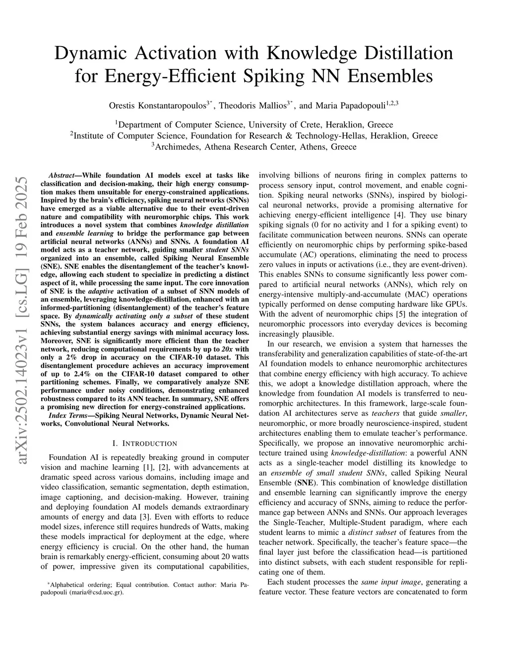 While foundation AI models excel at tasks like classification and decision-making, their high energy consumption makes them unsuitable for energy-constrained applications. Inspired by the brain's efficiency, spiking neural networks (SNNs) have emerged as a viable alternative due to their event-driven nature and compatibility with neuromorphic chips. This work introduces a novel system that combines knowledge distillation and ensemble learning to bridge the performance gap between artificial neural networks (ANNs) and SNNs. A foundation AI model acts as a teacher network, guiding smaller student SNNs organized into an ensemble, called Spiking Neural Ensemble (SNE). SNE enables the disentanglement of the teacher's knowledge, allowing each student to specialize in predicting a distinct aspect of it, while processing the same input. The core innovation of SNE is the adaptive activation of a subset of SNN models of an ensemble, leveraging knowledge-distillation, enhanced with an informed-partitioning (disentanglement) of the teacher's feature space. By dynamically activating only a subset of these student SNNs, the system balances accuracy and energy efficiency, achieving substantial energy savings with minimal accuracy loss. Moreover, SNE is significantly more efficient than the teacher network, reducing computational requirements by up to 20x with only a 2% drop in accuracy on the CIFAR-10 dataset. This disentanglement procedure achieves an accuracy improvement of up to 2.4% on the CIFAR-10 dataset compared to other partitioning schemes. Finally, we comparatively analyze SNE performance under noisy conditions, demonstrating enhanced robustness compared to its ANN teacher. In summary, SNE offers a promising new direction for energy-constrained applications.