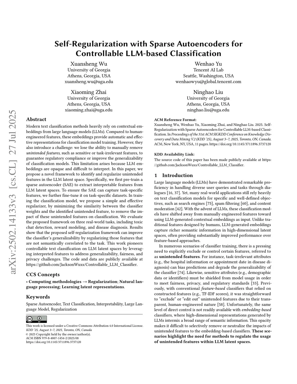 Self-Regularization with Sparse Autoencoders for Controllable LLM-based Classification