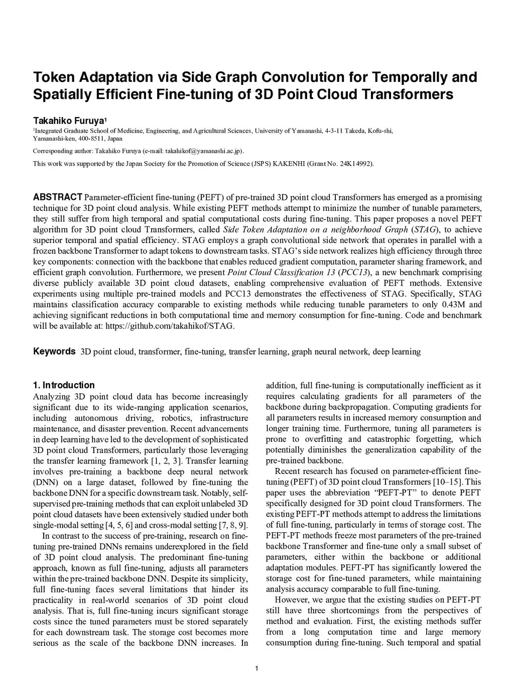Parameter-efficient fine-tuning (PEFT) of pre-trained 3D point cloud Transformers has emerged as a promising technique for 3D point cloud analysis. While existing PEFT methods attempt to minimize the number of tunable parameters, they often suffer from high temporal and spatial computational costs during fine-tuning. This paper proposes a novel PEFT algorithm called Side Token Adaptation on a neighborhood Graph (STAG) to achieve superior temporal and spatial efficiency. STAG employs a graph convolutional side network operating in parallel with a frozen backbone Transformer to adapt tokens to downstream tasks. Through efficient graph convolution, parameter sharing, and reduced gradient computation, STAG significantly reduces both temporal and spatial costs for fine-tuning. We also present Point Cloud Classification 13 (PCC13), a new benchmark comprising diverse publicly available 3D point cloud datasets to facilitate comprehensive evaluation. Extensive experiments using multiple pre-trained models and PCC13 demonstrates the effectiveness of STAG. Specifically, STAG maintains classification accuracy comparable to existing methods while reducing tunable parameters to only 0.43M and achieving significant reductions in both computation time and memory consumption for fine-tuning. Code and benchmark will be available at:this https URL.