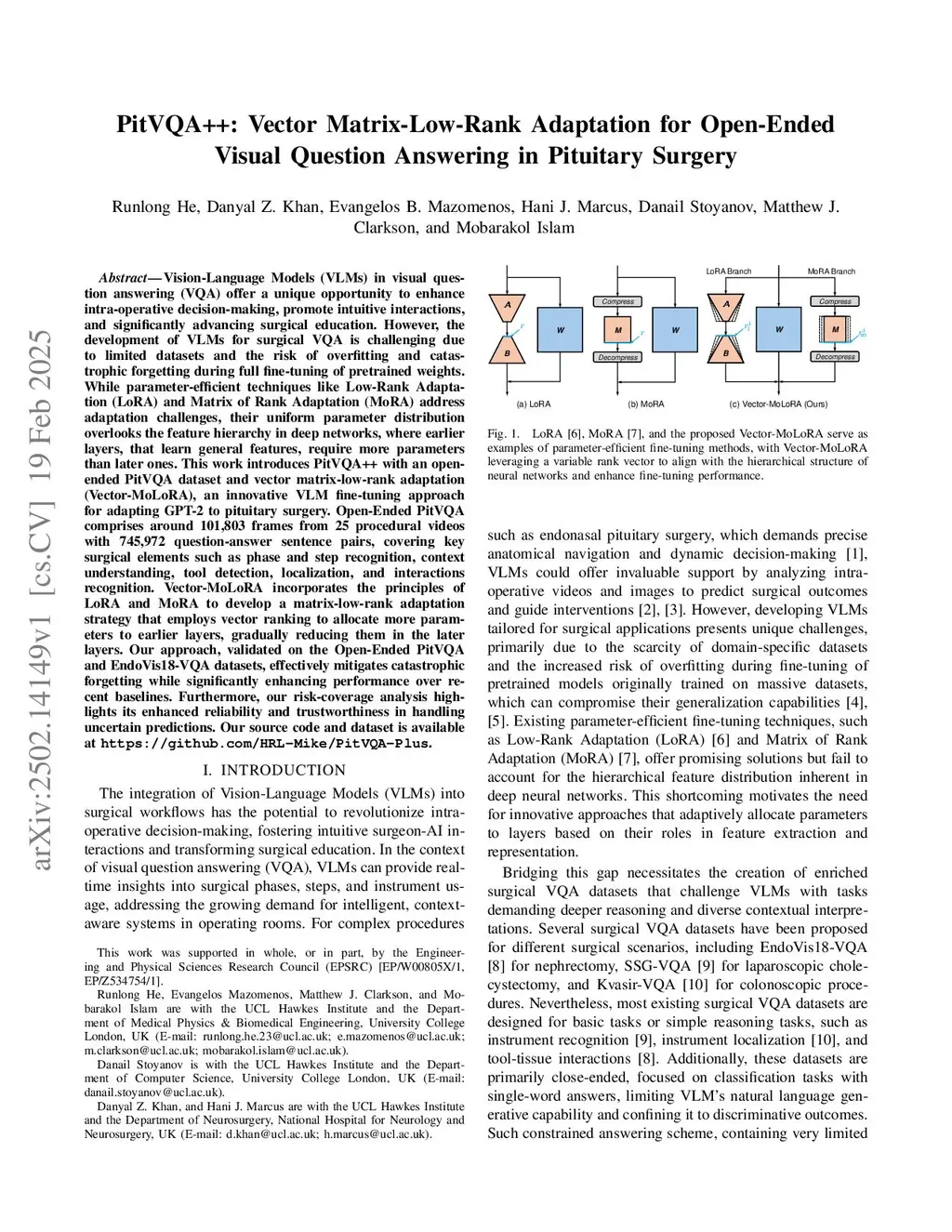 Vision-Language Models (VLMs) in visual question answering (VQA) offer a unique opportunity to enhance intra-operative decision-making, promote intuitive interactions, and significantly advancing surgical education. However, the development of VLMs for surgical VQA is challenging due to limited datasets and the risk of overfitting and catastrophic forgetting during full fine-tuning of pretrained weights. While parameter-efficient techniques like Low-Rank Adaptation (LoRA) and Matrix of Rank Adaptation (MoRA) address adaptation challenges, their uniform parameter distribution overlooks the feature hierarchy in deep networks, where earlier layers, that learn general features, require more parameters than later ones. This work introduces PitVQA++ with an open-ended PitVQA dataset and vector matrix-low-rank adaptation (Vector-MoLoRA), an innovative VLM fine-tuning approach for adapting GPT-2 to pituitary surgery. Open-Ended PitVQA comprises around 101,803 frames from 25 procedural videos with 745,972 question-answer sentence pairs, covering key surgical elements such as phase and step recognition, context understanding, tool detection, localization, and interactions recognition. Vector-MoLoRA incorporates the principles of LoRA and MoRA to develop a matrix-low-rank adaptation strategy that employs vector ranking to allocate more parameters to earlier layers, gradually reducing them in the later layers. Our approach, validated on the Open-Ended PitVQA and EndoVis18-VQA datasets, effectively mitigates catastrophic forgetting while significantly enhancing performance over recent baselines. Furthermore, our risk-coverage analysis highlights its enhanced reliability and trustworthiness in handling uncertain predictions. Our source code and dataset is available at~\url{this https URL}.