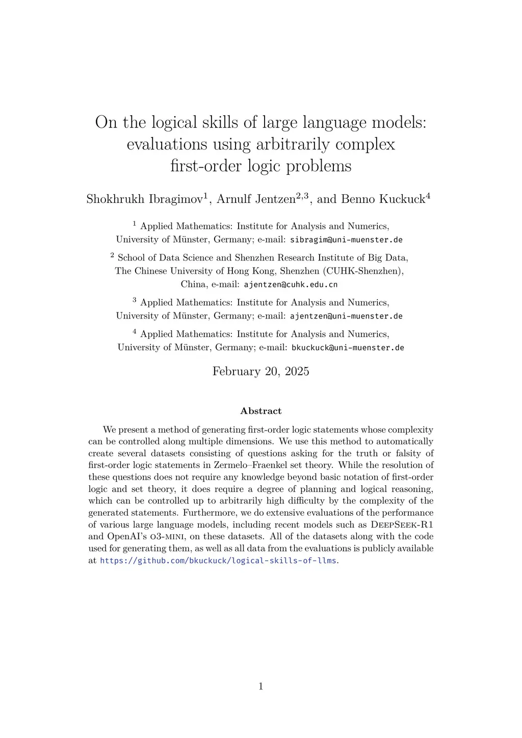 We present a method of generating first-order logic statements whose complexity can be controlled along multiple dimensions. We use this method to automatically create several datasets consisting of questions asking for the truth or falsity of first-order logic statements in Zermelo-Fraenkel set theory. While the resolution of these questions does not require any knowledge beyond basic notation of first-order logic and set theory, it does require a degree of planning and logical reasoning, which can be controlled up to arbitrarily high difficulty by the complexity of the generated statements. Furthermore, we do extensive evaluations of the performance of various large language models, including recent models such as DeepSeek-R1 and OpenAI's o3-mini, on these datasets. All of the datasets along with the code used for generating them, as well as all data from the evaluations is publicly available atthis https URL.