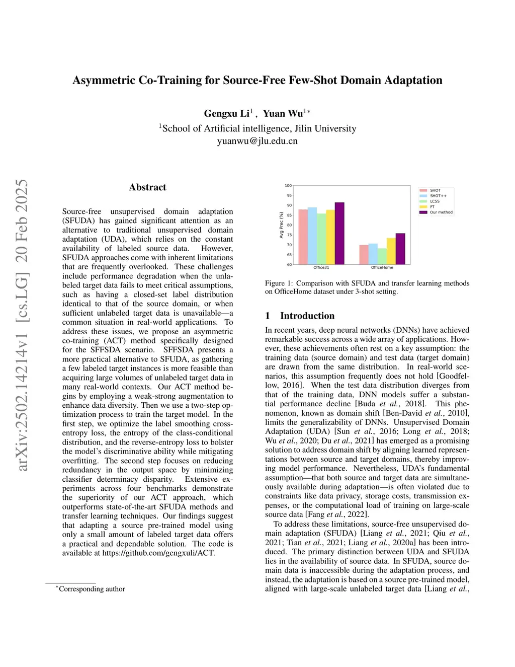 Source-free unsupervised domain adaptation (SFUDA) has gained significant attention as an alternative to traditional unsupervised domain adaptation (UDA), which relies on the constant availability of labeled source data. However, SFUDA approaches come with inherent limitations that are frequently overlooked. These challenges include performance degradation when the unlabeled target data fails to meet critical assumptions, such as having a closed-set label distribution identical to that of the source domain, or when sufficient unlabeled target data is unavailable-a common situation in real-world applications. To address these issues, we propose an asymmetric co-training (ACT) method specifically designed for the SFFSDA scenario. SFFSDA presents a more practical alternative to SFUDA, as gathering a few labeled target instances is more feasible than acquiring large volumes of unlabeled target data in many real-world contexts. Our ACT method begins by employing a weak-strong augmentation to enhance data diversity. Then we use a two-step optimization process to train the target model. In the first step, we optimize the label smoothing cross-entropy loss, the entropy of the class-conditional distribution, and the reverse-entropy loss to bolster the model's discriminative ability while mitigating overfitting. The second step focuses on reducing redundancy in the output space by minimizing classifier determinacy disparity. Extensive experiments across four benchmarks demonstrate the superiority of our ACT approach, which outperforms state-of-the-art SFUDA methods and transfer learning techniques. Our findings suggest that adapting a source pre-trained model using only a small amount of labeled target data offers a practical and dependable solution. The code is available atthis https URL.