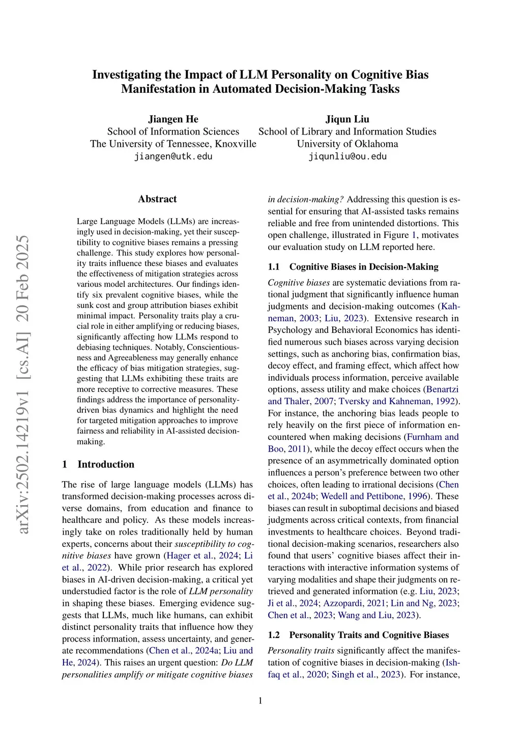 Large Language Models (LLMs) are increasingly used in decision-making, yet their susceptibility to cognitive biases remains a pressing challenge. This study explores how personality traits influence these biases and evaluates the effectiveness of mitigation strategies across various model architectures. Our findings identify six prevalent cognitive biases, while the sunk cost and group attribution biases exhibit minimal impact. Personality traits play a crucial role in either amplifying or reducing biases, significantly affecting how LLMs respond to debiasing techniques. Notably, Conscientiousness and Agreeableness may generally enhance the efficacy of bias mitigation strategies, suggesting that LLMs exhibiting these traits are more receptive to corrective measures. These findings address the importance of personality-driven bias dynamics and highlight the need for targeted mitigation approaches to improve fairness and reliability in AI-assisted decision-making.