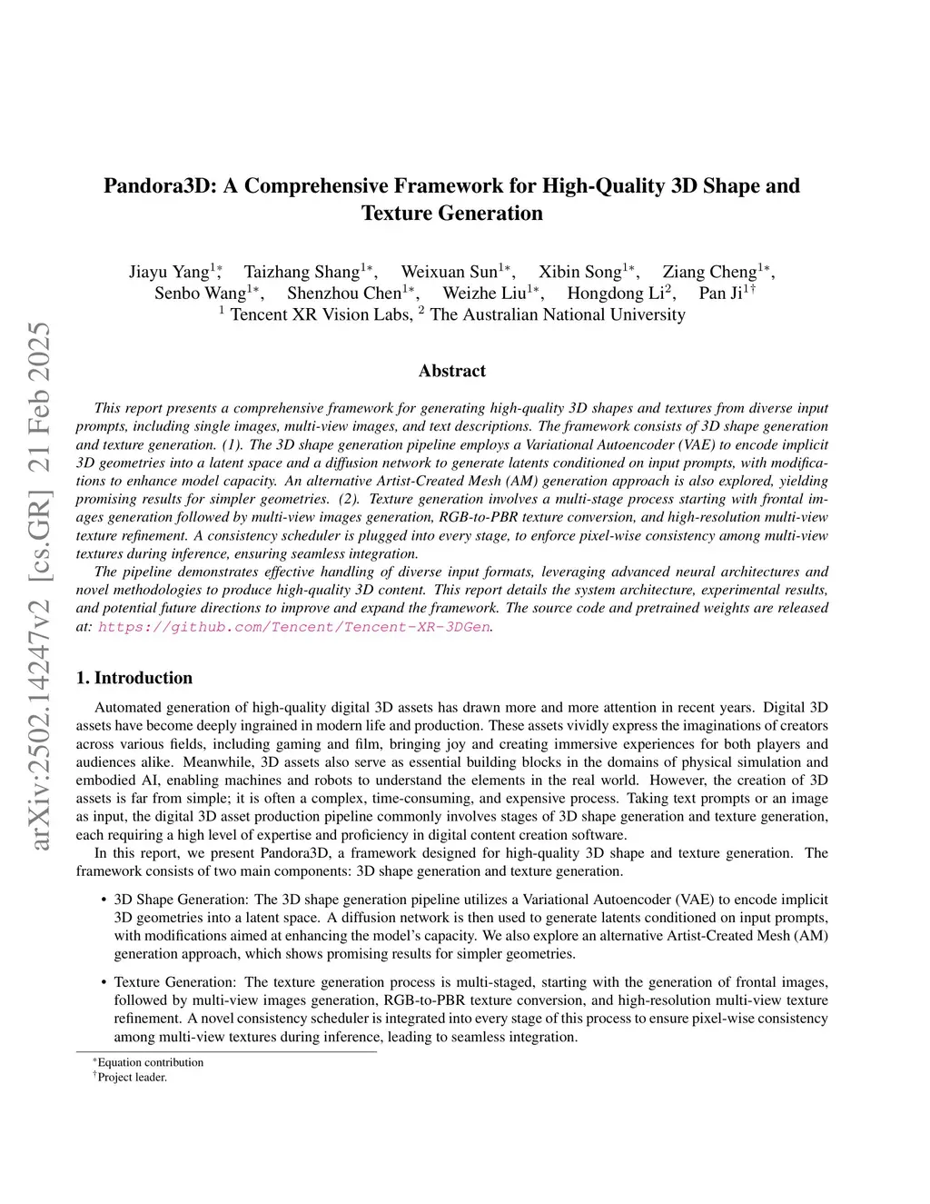 This report presents a comprehensive framework for generating high-quality 3D shapes and textures from diverse input prompts, including single images, multi-view images, and text descriptions. The framework consists of 3D shape generation and texture generation. (1). The 3D shape generation pipeline employs a Variational Autoencoder (VAE) to encode implicit 3D geometries into a latent space and a diffusion network to generate latents conditioned on input prompts, with modifications to enhance model capacity. An alternative Artist-Created Mesh (AM) generation approach is also explored, yielding promising results for simpler geometries. (2). Texture generation involves a multi-stage process starting with frontal images generation followed by multi-view images generation, RGB-to-PBR texture conversion, and high-resolution multi-view texture refinement. A consistency scheduler is plugged into every stage, to enforce pixel-wise consistency among multi-view textures during inference, ensuring seamless integration.The pipeline demonstrates effective handling of diverse input formats, leveraging advanced neural architectures and novel methodologies to produce high-quality 3D content. This report details the system architecture, experimental results, and potential future directions to improve and expand the framework. The source code and pretrained weights are released at:this https URL.