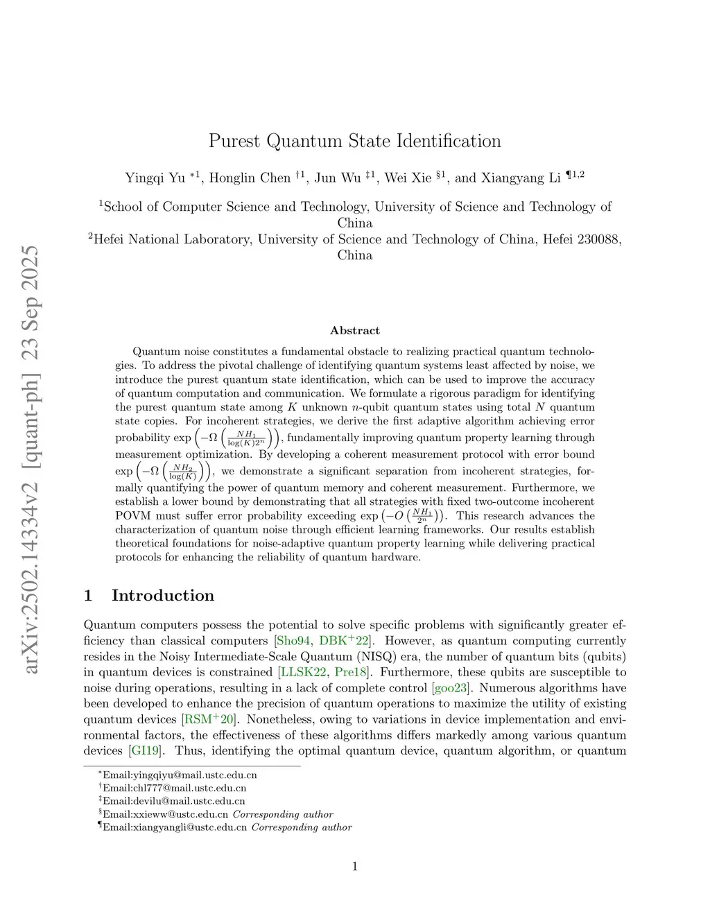 Quantum noise constitutes a fundamental obstacle to realizing practical quantum technologies. To address the pivotal challenge of identifying quantum systems least affected by noise, we introduce the purest quantum state identification, which can be used to improve the accuracy of quantum computation and communication. We formulate a rigorous paradigm for identifying the purest quantum state among unknown -qubit quantum states using total quantum state copies. For incoherent strategies, we derive the first adaptive algorithm achieving error probability , fundamentally improving quantum property learning through measurement optimization. By developing a coherent measurement protocol with error bound , we demonstrate a significant separation from incoherent strategies, formally quantifying the power of quantum memory and coherent measurement. Furthermore, we establish a lower bound by demonstrating that all strategies with fixed two-outcome incoherent POVM must suffer error probability exceeding $ \exp\left( - O\left(\frac{NH_1}{2^n}\right)\right)$. This research advances the characterization of quantum noise through efficient learning frameworks. Our results establish theoretical foundations for noise-adaptive quantum property learning while delivering practical protocols for enhancing the reliability of quantum hardware.