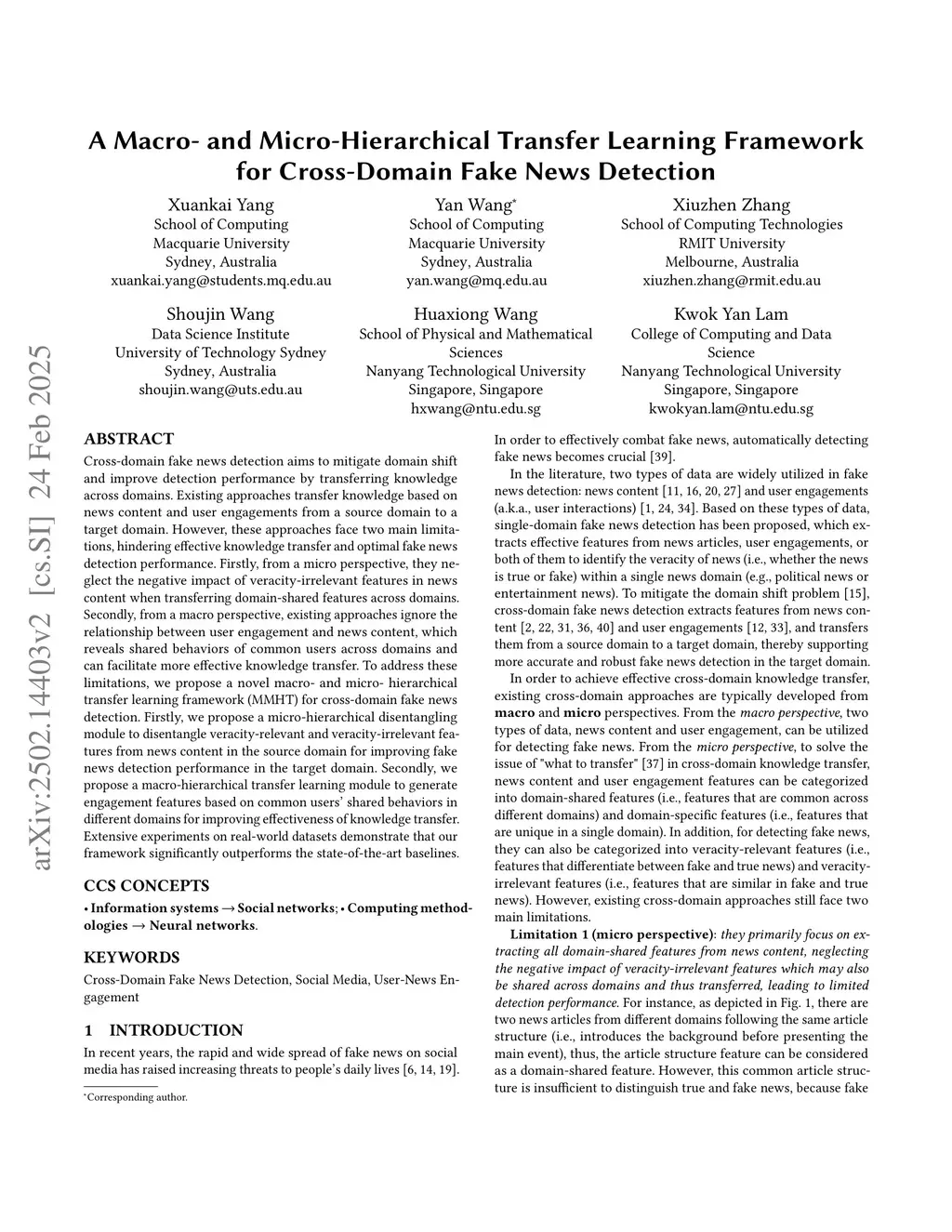 A Macro- and Micro-Hierarchical Transfer Learning Framework for Cross-Domain Fake News Detection