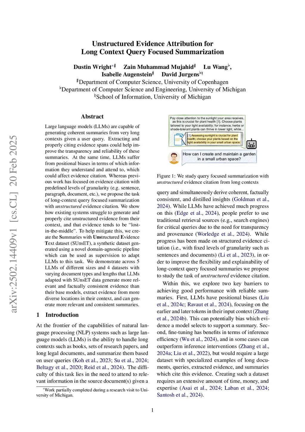 Unstructured Evidence Attribution for Long Context Query Focused Summarization