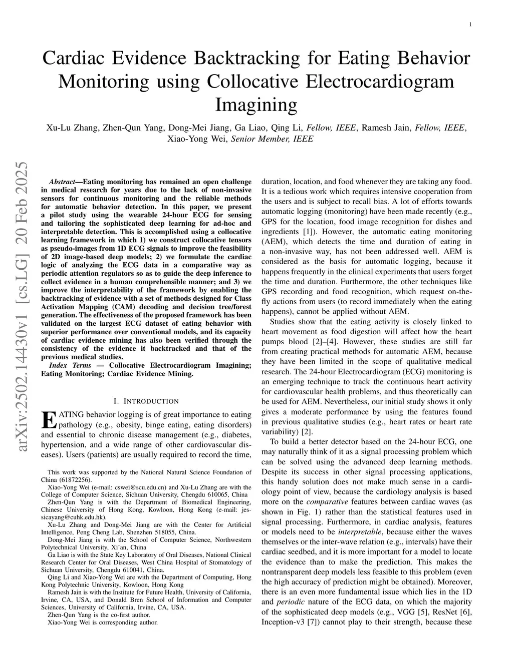 Eating monitoring has remained an open challenge in medical research for years due to the lack of non-invasive sensors for continuous monitoring and the reliable methods for automatic behavior detection. In this paper, we present a pilot study using the wearable 24-hour ECG for sensing and tailoring the sophisticated deep learning for ad-hoc and interpretable detection. This is accomplished using a collocative learning framework in which 1) we construct collocative tensors as pseudo-images from 1D ECG signals to improve the feasibility of 2D image-based deep models; 2) we formulate the cardiac logic of analyzing the ECG data in a comparative way as periodic attention regulators so as to guide the deep inference to collect evidence in a human comprehensible manner; and 3) we improve the interpretability of the framework by enabling the backtracking of evidence with a set of methods designed for Class Activation Mapping (CAM) decoding and decision tree/forest generation. The effectiveness of the proposed framework has been validated on the largest ECG dataset of eating behavior with superior performance over conventional models, and its capacity of cardiac evidence mining has also been verified through the consistency of the evidence it backtracked and that of the previous medical studies.