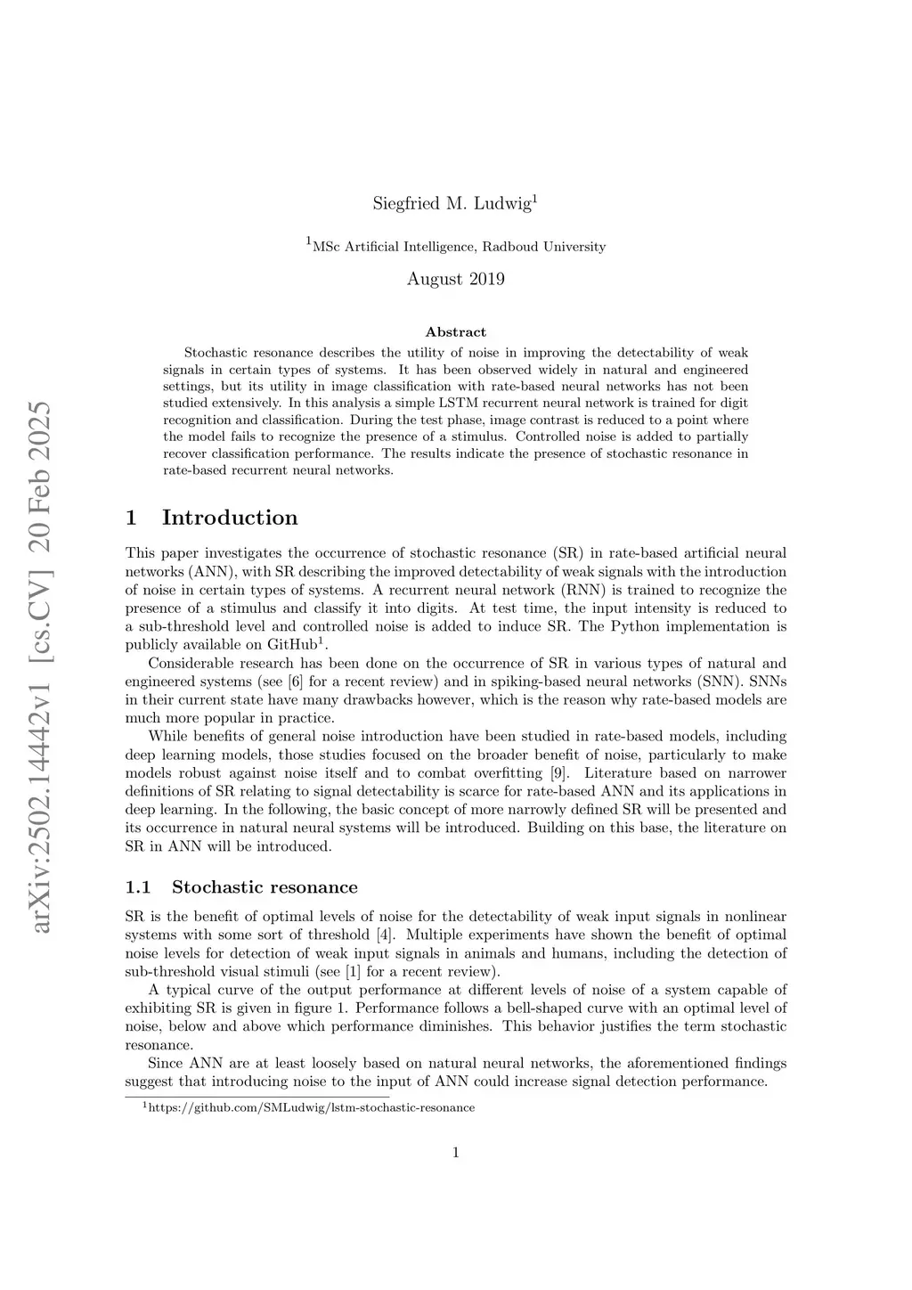 Stochastic resonance describes the utility of noise in improving the detectability of weak signals in certain types of systems. It has been observed widely in natural and engineered settings, but its utility in image classification with rate-based neural networks has not been studied extensively. In this analysis a simple LSTM recurrent neural network is trained for digit recognition and classification. During the test phase, image contrast is reduced to a point where the model fails to recognize the presence of a stimulus. Controlled noise is added to partially recover classification performance. The results indicate the presence of stochastic resonance in rate-based recurrent neural networks.