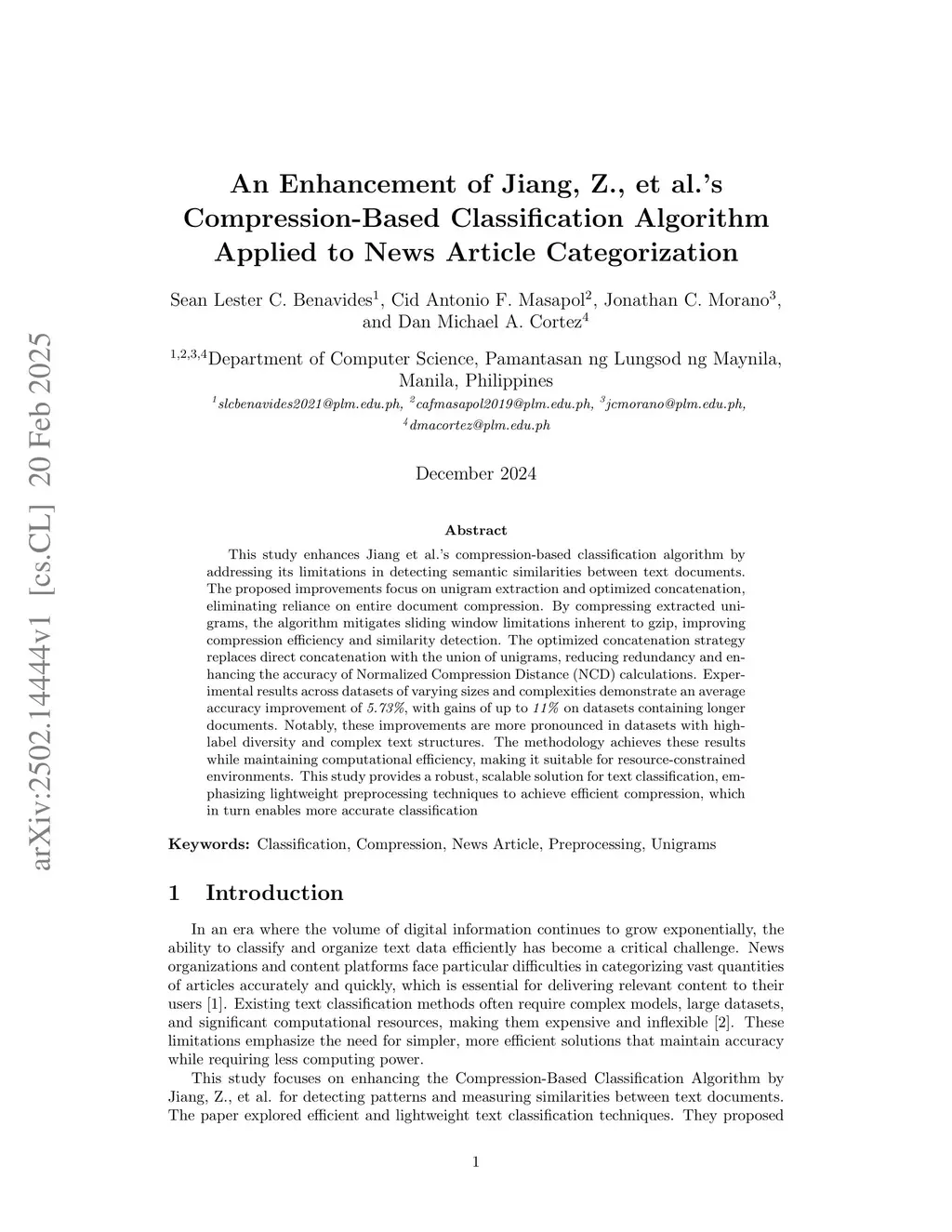 This study enhances Jiang et al.'s compression-based classification algorithm by addressing its limitations in detecting semantic similarities between text documents. The proposed improvements focus on unigram extraction and optimized concatenation, eliminating reliance on entire document compression. By compressing extracted unigrams, the algorithm mitigates sliding window limitations inherent to gzip, improving compression efficiency and similarity detection. The optimized concatenation strategy replaces direct concatenation with the union of unigrams, reducing redundancy and enhancing the accuracy of Normalized Compression Distance (NCD) calculations. Experimental results across datasets of varying sizes and complexities demonstrate an average accuracy improvement of 5.73%, with gains of up to 11% on datasets containing longer documents. Notably, these improvements are more pronounced in datasets with high-label diversity and complex text structures. The methodology achieves these results while maintaining computational efficiency, making it suitable for resource-constrained environments. This study provides a robust, scalable solution for text classification, emphasizing lightweight preprocessing techniques to achieve efficient compression, which in turn enables more accurate classification.