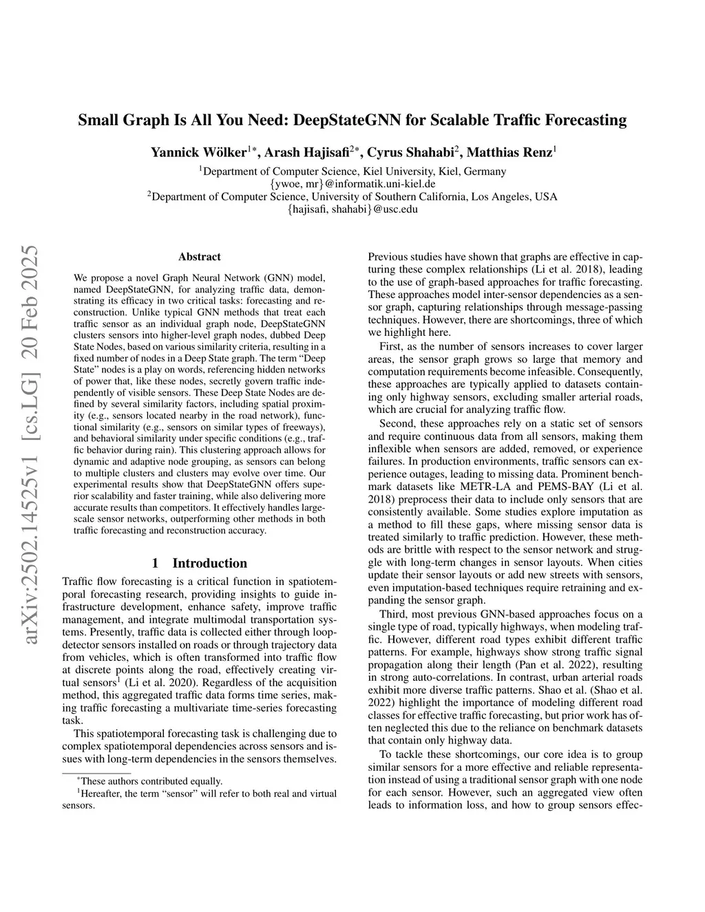 We propose a novel Graph Neural Network (GNN) model, named DeepStateGNN, for analyzing traffic data, demonstrating its efficacy in two critical tasks: forecasting and reconstruction. Unlike typical GNN methods that treat each traffic sensor as an individual graph node, DeepStateGNN clusters sensors into higher-level graph nodes, dubbed Deep State Nodes, based on various similarity criteria, resulting in a fixed number of nodes in a Deep State graph. The term "Deep State" nodes is a play on words, referencing hidden networks of power that, like these nodes, secretly govern traffic independently of visible sensors. These Deep State Nodes are defined by several similarity factors, including spatial proximity (e.g., sensors located nearby in the road network), functional similarity (e.g., sensors on similar types of freeways), and behavioral similarity under specific conditions (e.g., traffic behavior during rain). This clustering approach allows for dynamic and adaptive node grouping, as sensors can belong to multiple clusters and clusters may evolve over time. Our experimental results show that DeepStateGNN offers superior scalability and faster training, while also delivering more accurate results than competitors. It effectively handles large-scale sensor networks, outperforming other methods in both traffic forecasting and reconstruction accuracy.