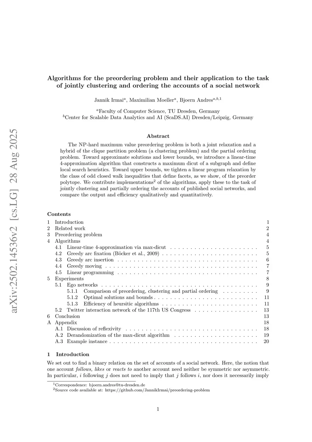 Algorithms for the preordering problem and their application to the task of jointly clustering and ordering the accounts of a social network