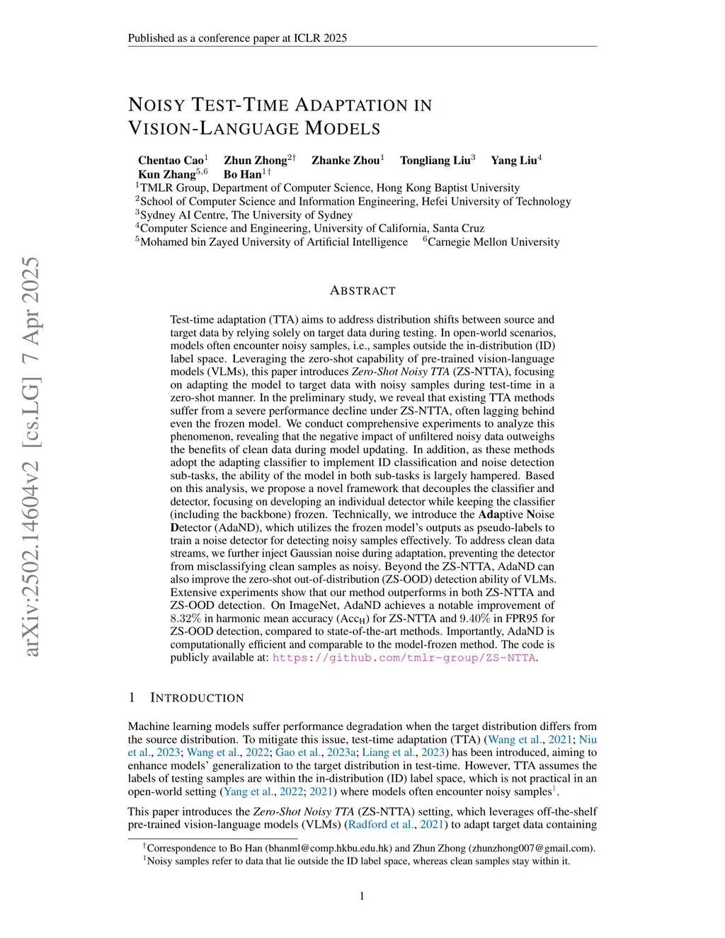 Test-time adaptation (TTA) aims to address distribution shifts between source and target data by relying solely on target data during testing. In open-world scenarios, models often encounter noisy samples, i.e., samples outside the in-distribution (ID) label space. Leveraging the zero-shot capability of pre-trained vision-language models (VLMs), this paper introduces Zero-Shot Noisy TTA (ZS-NTTA), focusing on adapting the model to target data with noisy samples during test-time in a zero-shot manner. We find existing TTA methods underperform under ZS-NTTA, often lagging behind even the frozen model. We conduct comprehensive experiments to analyze this phenomenon, revealing that the negative impact of unfiltered noisy data outweighs the benefits of clean data during model updating. Also, adapting a classifier for ID classification and noise detection hampers both sub-tasks. Built on this, we propose a framework that decouples the classifier and detector, focusing on developing an individual detector while keeping the classifier frozen. Technically, we introduce the Adaptive Noise Detector (AdaND), which utilizes the frozen model's outputs as pseudo-labels to train a noise detector. To handle clean data streams, we further inject Gaussian noise during adaptation, preventing the detector from misclassifying clean samples as noisy. Beyond the ZS-NTTA, AdaND can also improve the zero-shot out-of-distribution (ZS-OOD) detection ability of VLMs. Experiments show that AdaND outperforms in both ZS-NTTA and ZS-OOD detection. On ImageNet, AdaND achieves a notable improvement of in harmonic mean accuracy () for ZS-NTTA and in FPR95 for ZS-OOD detection, compared to SOTA methods. Importantly, AdaND is computationally efficient and comparable to the model-frozen method. The code is publicly available at:this https URL.