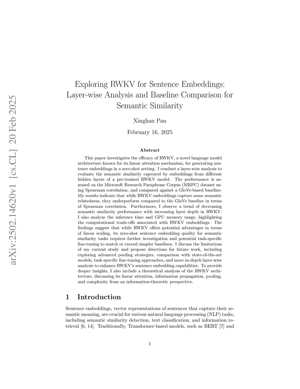 This paper investigates the efficacy of RWKV, a novel language model architecture known for its linear attention mechanism, for generating sentence embeddings in a zero-shot setting. I conduct a layer-wise analysis to evaluate the semantic similarity captured by embeddings from different hidden layers of a pre-trained RWKV model. The performance is assessed on the Microsoft Research Paraphrase Corpus (MRPC) dataset using Spearman correlation and compared against a GloVe-based baseline. My results indicate that while RWKV embeddings capture some semantic relatedness, they underperform compared to the GloVe baseline in terms of Spearman correlation. I also analyze the inference time and GPU memory usage, highlighting the computational trade-offs associated with RWKV embeddings. The findings suggest that while RWKV offers potential advantages in terms of linear scaling, its zero-shot sentence embedding quality for semantic similarity tasks requires further investigation and potential task-specific fine-tuning to match or exceed simpler baselines.