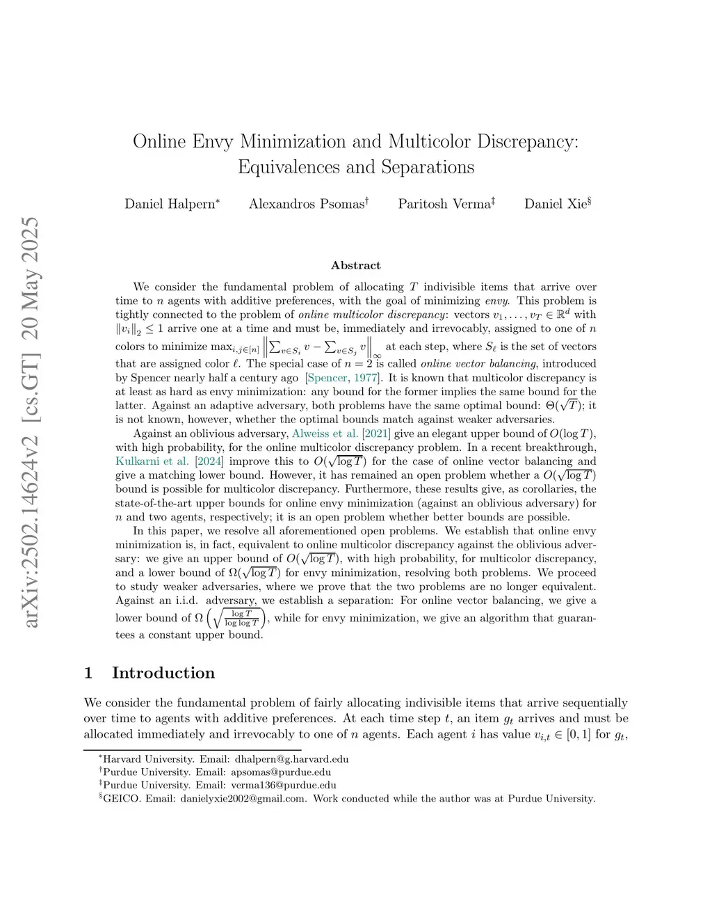 We consider the fundamental problem of allocating indivisible items that arrive over time to agents with additive preferences, with the goal of minimizing envy. This problem is tightly connected to online multicolor discrepancy: vectors with arrive over time and must be, immediately and irrevocably, assigned to one of colors to minimize at each step, where is the set of vectors that are assigned color . The special case of is called online vector balancing. Any bound for multicolor discrepancy implies the same bound for envy minimization. Against an adaptive adversary, both problems have the same optimal bound, , but whether this holds for weaker adversaries is unknown.Against an oblivious adversary, Alweiss et al. give a bound, with high probability, for multicolor discrepancy. Kulkarni et al. improve this to for vector balancing and give a matching lower bound. Whether a bound holds for multicolor discrepancy remains open. These results imply the best-known upper bounds for envy minimization (for an oblivious adversary) for and two agents, respectively; whether better bounds exist is open.In this paper, we resolve all aforementioned open problems. We prove that online envy minimization and multicolor discrepancy are equivalent against an oblivious adversary: we give a upper bound for multicolor discrepancy, and a lower bound for envy minimization. For a weaker, i.i.d. adversary, we prove a separation: For online vector balancing, we give a lower bound, while for envy minimization, we give an algorithm that guarantees a constant upper bound.