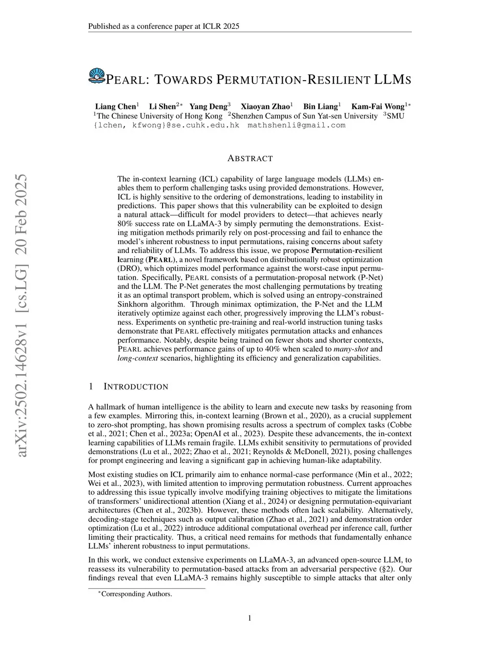 The in-context learning (ICL) capability of large language models (LLMs) enables them to perform challenging tasks using provided demonstrations. However, ICL is highly sensitive to the ordering of demonstrations, leading to instability in predictions. This paper shows that this vulnerability can be exploited to design a natural attack - difficult for model providers to detect - that achieves nearly 80% success rate on LLaMA-3 by simply permuting the demonstrations. Existing mitigation methods primarily rely on post-processing and fail to enhance the model's inherent robustness to input permutations, raising concerns about safety and reliability of LLMs. To address this issue, we propose Permutation-resilient learning (PEARL), a novel framework based on distributionally robust optimization (DRO), which optimizes model performance against the worst-case input permutation. Specifically, PEARL consists of a permutation-proposal network (P-Net) and the LLM. The P-Net generates the most challenging permutations by treating it as an optimal transport problem, which is solved using an entropy-constrained Sinkhorn algorithm. Through minimax optimization, the P-Net and the LLM iteratively optimize against each other, progressively improving the LLM's robustness. Experiments on synthetic pre-training and real-world instruction tuning tasks demonstrate that PEARL effectively mitigates permutation attacks and enhances performance. Notably, despite being trained on fewer shots and shorter contexts, PEARL achieves performance gains of up to 40% when scaled to many-shot and long-context scenarios, highlighting its efficiency and generalization capabilities.