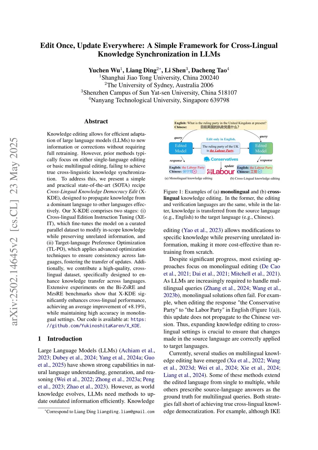 Knowledge editing allows for efficient adaptation of large language models (LLMs) to new information or corrections without requiring full retraining. However, prior methods typically focus on either single-language editing or basic multilingual editing, failing to achieve true cross-linguistic knowledge synchronization. To address this, we present a simple and practical state-of-the-art (SOTA) recipe Cross-Lingual Knowledge Democracy Edit (X-KDE), designed to propagate knowledge from a dominant language to other languages effectively. Our X-KDE comprises two stages: (i) Cross-lingual Edition Instruction Tuning (XE-IT), which fine-tunes the model on a curated parallel dataset to modify in-scope knowledge while preserving unrelated information, and (ii) Target-language Preference Optimization (TL-PO), which applies advanced optimization techniques to ensure consistency across languages, fostering the transfer of updates. Additionally, we contribute a high-quality, cross-lingual dataset, specifically designed to enhance knowledge transfer across languages. Extensive experiments on the Bi-ZsRE and MzsRE benchmarks show that X-KDE significantly enhances cross-lingual performance, achieving an average improvement of +8.19%, while maintaining high accuracy in monolingual settings.