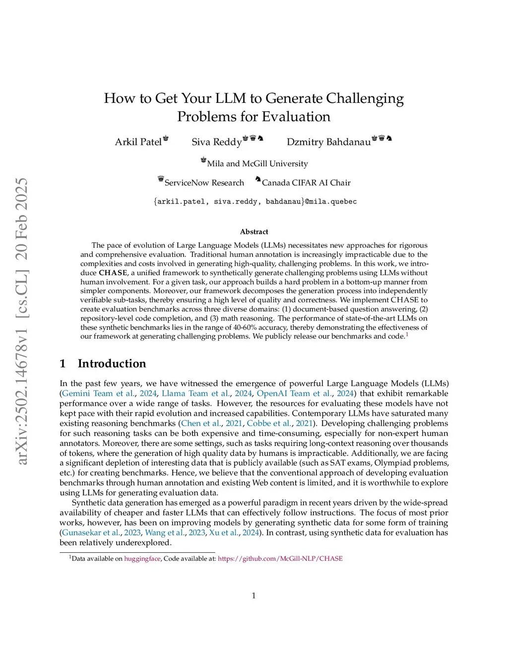 The pace of evolution of Large Language Models (LLMs) necessitates new approaches for rigorous and comprehensive evaluation. Traditional human annotation is increasingly impracticable due to the complexities and costs involved in generating high-quality, challenging problems. In this work, we introduce CHASE, a unified framework to synthetically generate challenging problems using LLMs without human involvement. For a given task, our approach builds a hard problem in a bottom-up manner from simpler components. Moreover, our framework decomposes the generation process into independently verifiable sub-tasks, thereby ensuring a high level of quality and correctness. We implement CHASE to create evaluation benchmarks across three diverse domains: (1) document-based question answering, (2) repository-level code completion, and (3) math reasoning. The performance of state-of-the-art LLMs on these synthetic benchmarks lies in the range of 40-60% accuracy, thereby demonstrating the effectiveness of our framework at generating challenging problems. We publicly release our benchmarks and code.