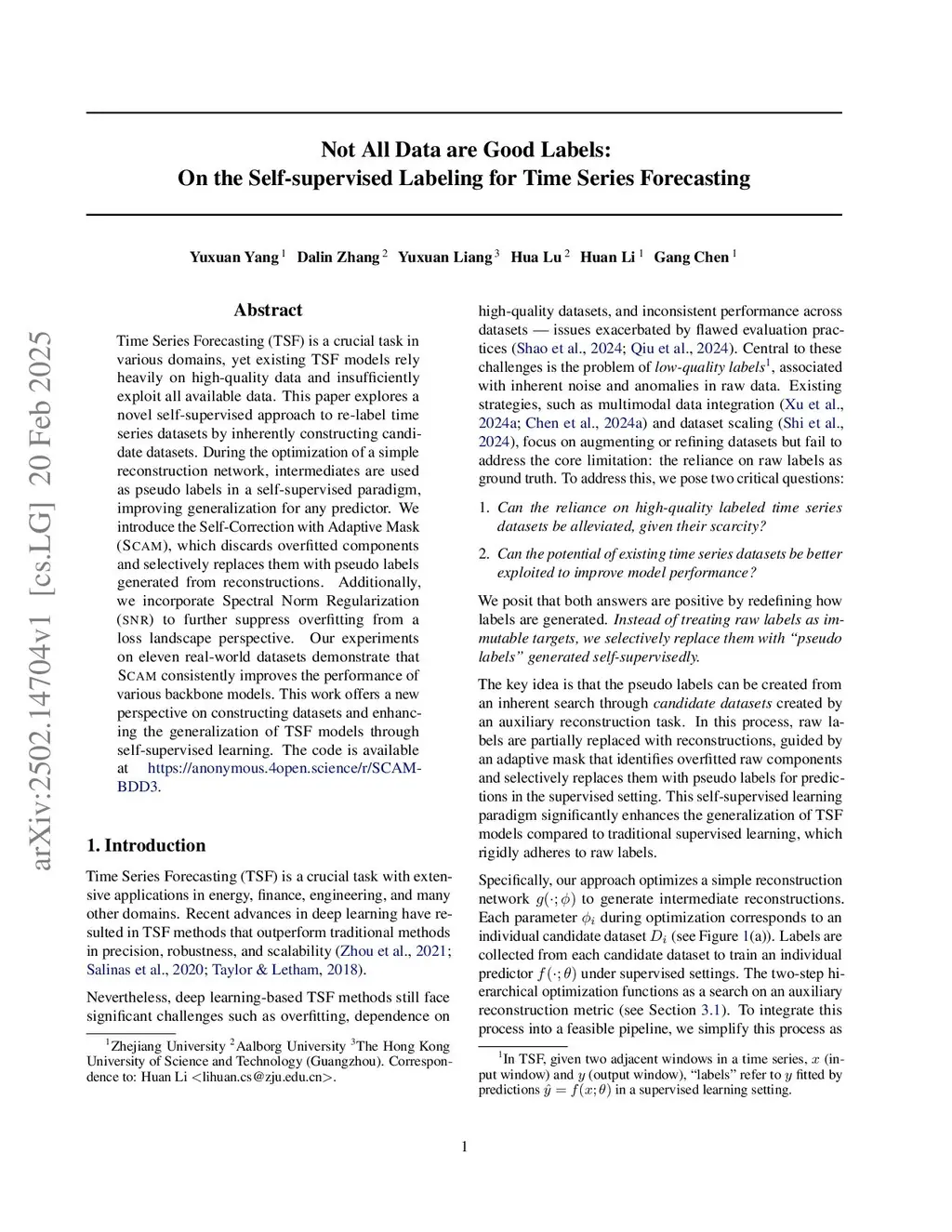 Time Series Forecasting (TSF) is a crucial task in various domains, yet existing TSF models rely heavily on high-quality data and insufficiently exploit all available data. This paper explores a novel self-supervised approach to re-label time series datasets by inherently constructing candidate datasets. During the optimization of a simple reconstruction network, intermediates are used as pseudo labels in a self-supervised paradigm, improving generalization for any predictor. We introduce the Self-Correction with Adaptive Mask (SCAM), which discards overfitted components and selectively replaces them with pseudo labels generated from reconstructions. Additionally, we incorporate Spectral Norm Regularization (SNR) to further suppress overfitting from a loss landscape perspective. Our experiments on eleven real-world datasets demonstrate that SCAM consistently improves the performance of various backbone models. This work offers a new perspective on constructing datasets and enhancing the generalization of TSF models through self-supervised learning. The code is available atthis https URL.