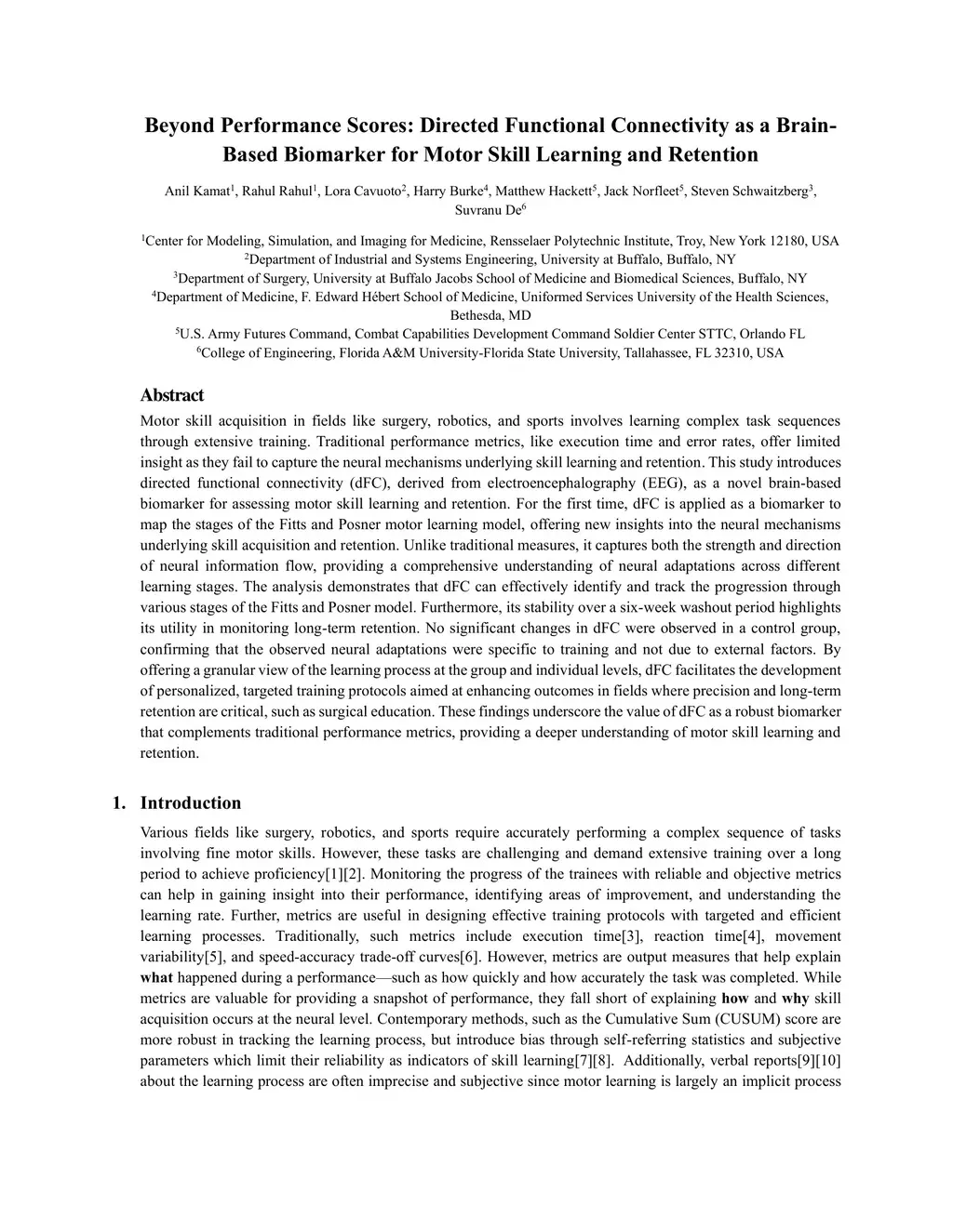 Motor skill acquisition in fields like surgery, robotics, and sports involves learning complex task sequences through extensive training. Traditional performance metrics, like execution time and error rates, offer limited insight as they fail to capture the neural mechanisms underlying skill learning and retention. This study introduces directed functional connectivity (dFC), derived from electroencephalography (EEG), as a novel brain-based biomarker for assessing motor skill learning and retention. For the first time, dFC is applied as a biomarker to map the stages of the Fitts and Posner motor learning model, offering new insights into the neural mechanisms underlying skill acquisition and retention. Unlike traditional measures, it captures both the strength and direction of neural information flow, providing a comprehensive understanding of neural adaptations across different learning stages. The analysis demonstrates that dFC can effectively identify and track the progression through various stages of the Fitts and Posner model. Furthermore, its stability over a six-week washout period highlights its utility in monitoring long-term retention. No significant changes in dFC were observed in a control group, confirming that the observed neural adaptations were specific to training and not due to external factors. By offering a granular view of the learning process at the group and individual levels, dFC facilitates the development of personalized, targeted training protocols aimed at enhancing outcomes in fields where precision and long-term retention are critical, such as surgical education. These findings underscore the value of dFC as a robust biomarker that complements traditional performance metrics, providing a deeper understanding of motor skill learning and retention.