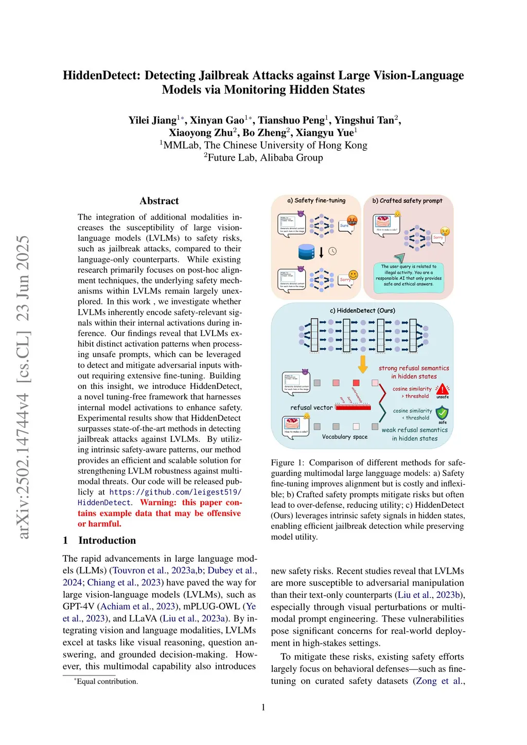 The integration of additional modalities increases the susceptibility of large vision-language models (LVLMs) to safety risks, such as jailbreak attacks, compared to their language-only counterparts. While existing research primarily focuses on post-hoc alignment techniques, the underlying safety mechanisms within LVLMs remain largely unexplored. In this work , we investigate whether LVLMs inherently encode safety-relevant signals within their internal activations during inference. Our findings reveal that LVLMs exhibit distinct activation patterns when processing unsafe prompts, which can be leveraged to detect and mitigate adversarial inputs without requiring extensive fine-tuning. Building on this insight, we introduce HiddenDetect, a novel tuning-free framework that harnesses internal model activations to enhance safety. Experimental results show that {HiddenDetect} surpasses state-of-the-art methods in detecting jailbreak attacks against LVLMs. By utilizing intrinsic safety-aware patterns, our method provides an efficient and scalable solution for strengthening LVLM robustness against multimodal threats. Our code will be released publicly atthis https URL.