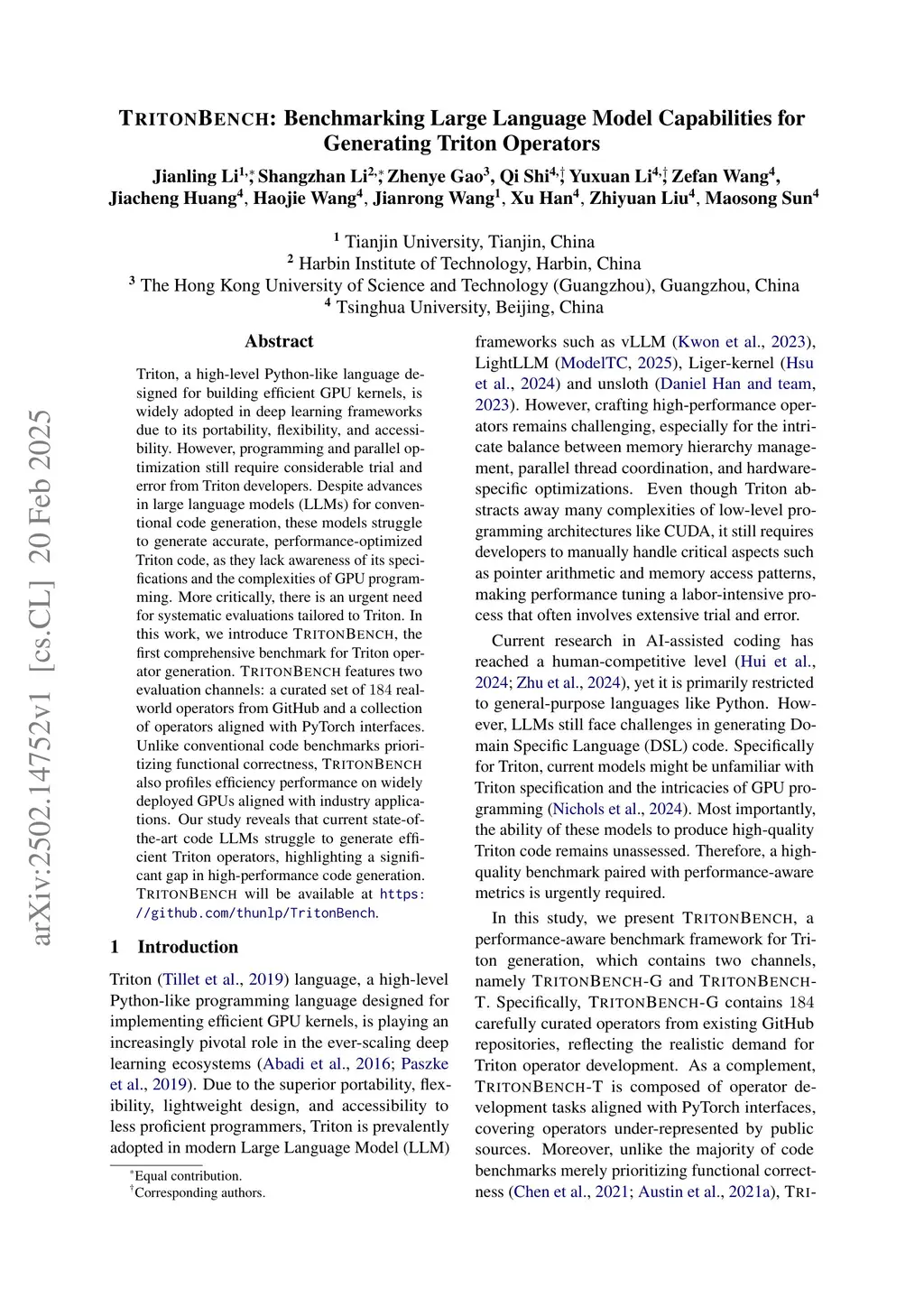 TritonBench: Benchmarking Large Language Model Capabilities for Generating Triton Operators