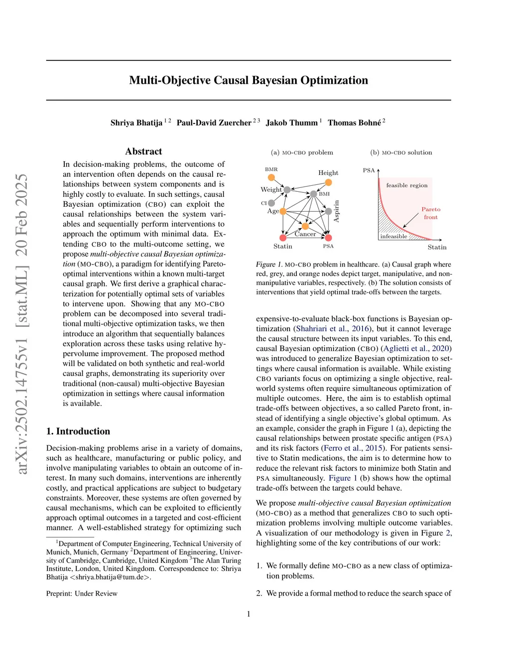 In decision-making problems, the outcome of an intervention often depends on the causal relationships between system components and is highly costly to evaluate. In such settings, causal Bayesian optimization (CBO) can exploit the causal relationships between the system variables and sequentially perform interventions to approach the optimum with minimal data. Extending CBO to the multi-outcome setting, we propose Multi-Objective Causal Bayesian Optimization (MO-CBO), a paradigm for identifying Pareto-optimal interventions within a known multi-target causal graph. We first derive a graphical characterization for potentially optimal sets of variables to intervene upon. Showing that any MO-CBO problem can be decomposed into several traditional multi-objective optimization tasks, we then introduce an algorithm that sequentially balances exploration across these tasks using relative hypervolume improvement. The proposed method will be validated on both synthetic and real-world causal graphs, demonstrating its superiority over traditional (non-causal) multi-objective Bayesian optimization in settings where causal information is available.