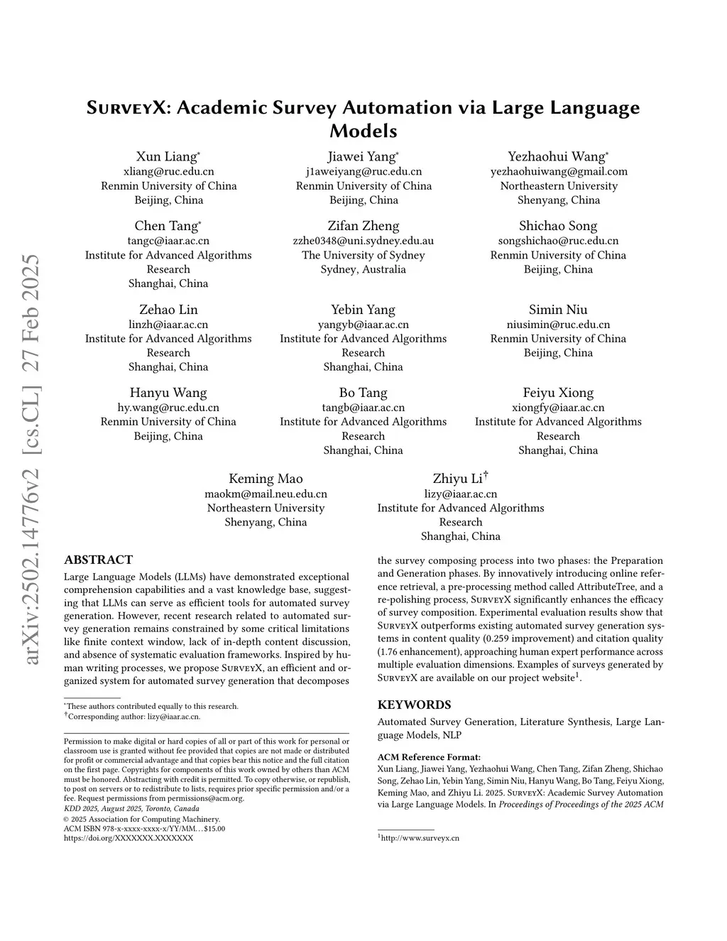 SurveyX: Academic Survey Automation via Large Language Models