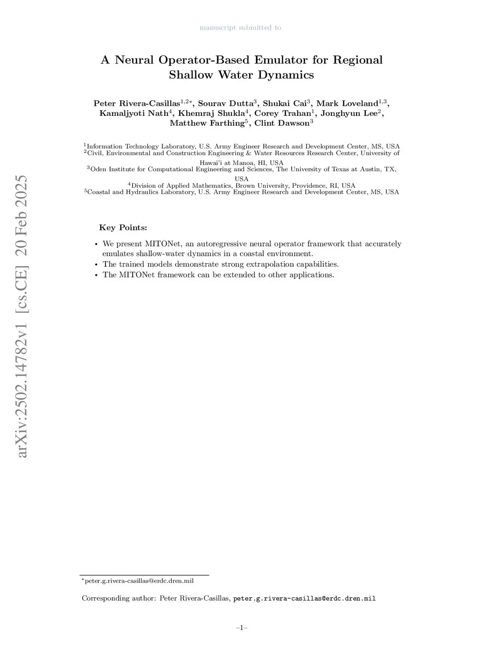 Coastal regions and river floodplains are particularly vulnerable to the impacts of extreme weather events. Accurate real-time forecasting of hydrodynamic processes in these areas is essential for infrastructure planning and climate adaptation. Yet high-fidelity numerical models are often too computationally expensive for real-time use, and lower-cost approaches, such as traditional model order reduction algorithms or conventional neural networks, typically struggle to generalize to out-of-distribution conditions. In this study, we present the Multiple-Input Temporal Operator Network (MITONet), a novel autoregressive neural emulator that employs latent-space operator learning to efficiently approximate high-dimensional numerical solvers for complex, nonlinear problems that are governed by time-dependent, parameterized partial differential equations. We showcase MITONet's predictive capabilities by forecasting regional tide-driven dynamics in the Shinnecock Inlet in New York and riverine flow in a section of the Red River in Louisiana, both described by the two-dimensional shallow-water equations (2D SWE), while incorporating initial conditions, time-varying boundary conditions, and domain parameters such as the bottom friction coefficient. Despite the distinct flow regimes, the complex geometries and meshes, and the wide range of bottom friction coefficients studied, MITONet displays consistently high predictive skill, with anomaly correlation coefficients above 0.9, a maximum normalized root mean square error of 0.011, and computational speedups between 100x-1,250x, even for 175 days of autoregressive rollout forecast from random initial conditions and with unseen parameter values.